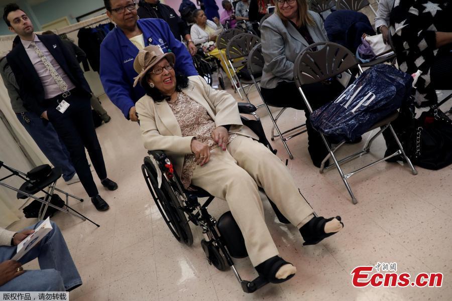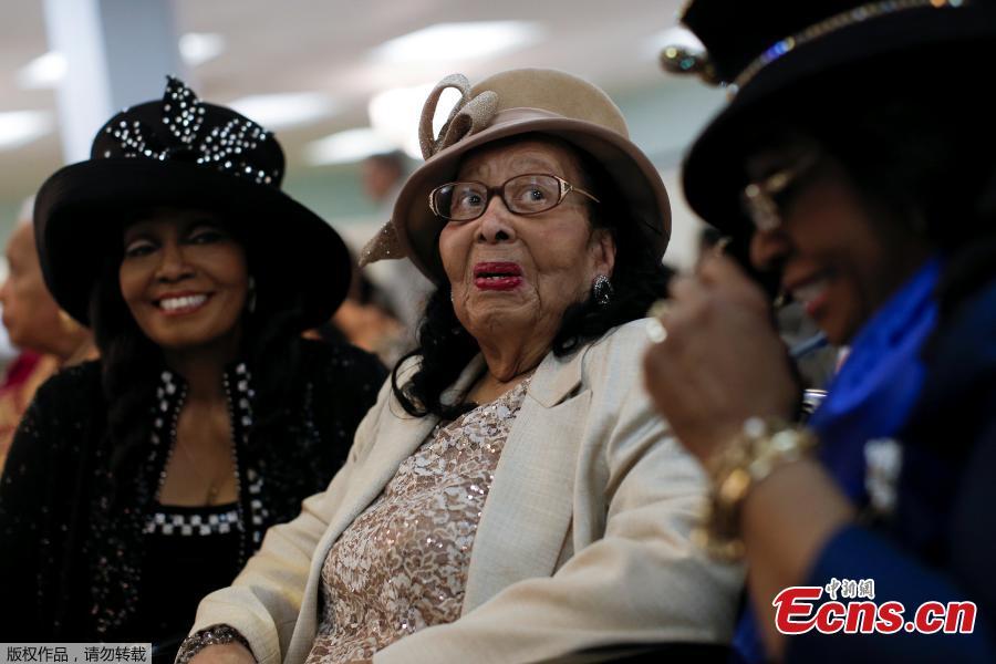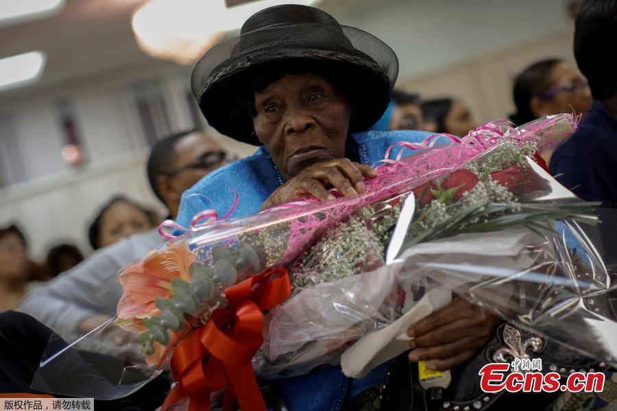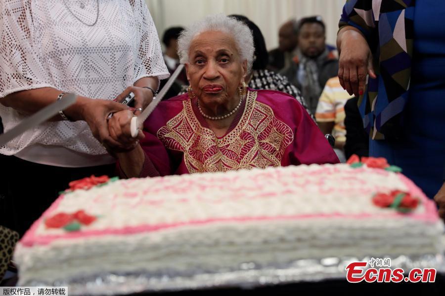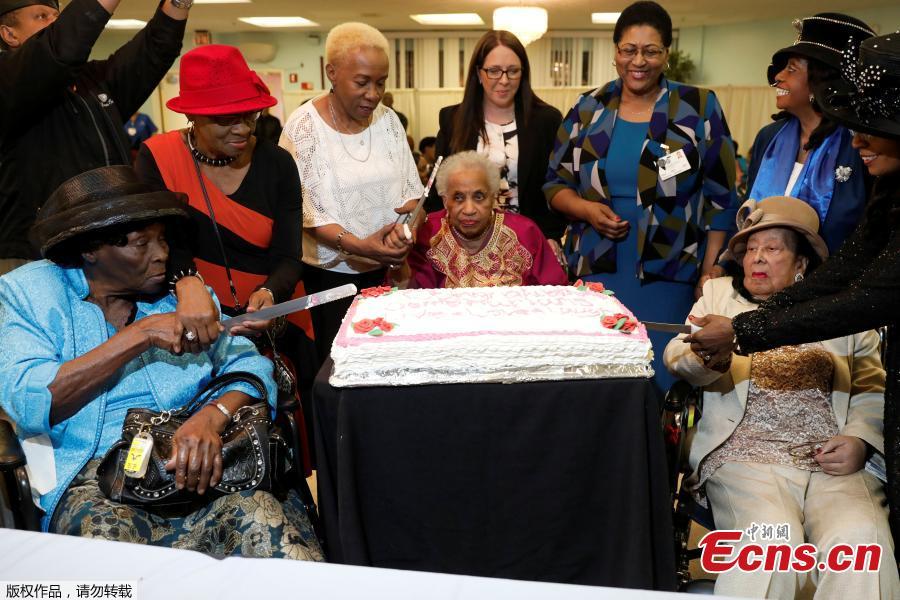 Three over 100-year-old women, 101-year-old Sophia Smith (L), 101-year-old Lucille Price (C) and 102-year-old Marie Baker (R) cut a cake at a birthday celebration for the three residents of the Crown Heights Center for Nursing and Rehabilitation in the Brooklyn Borough of New York City, March 6, 2017. (Photo/Agencies)