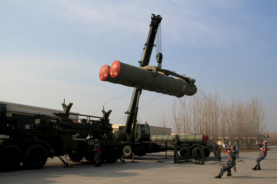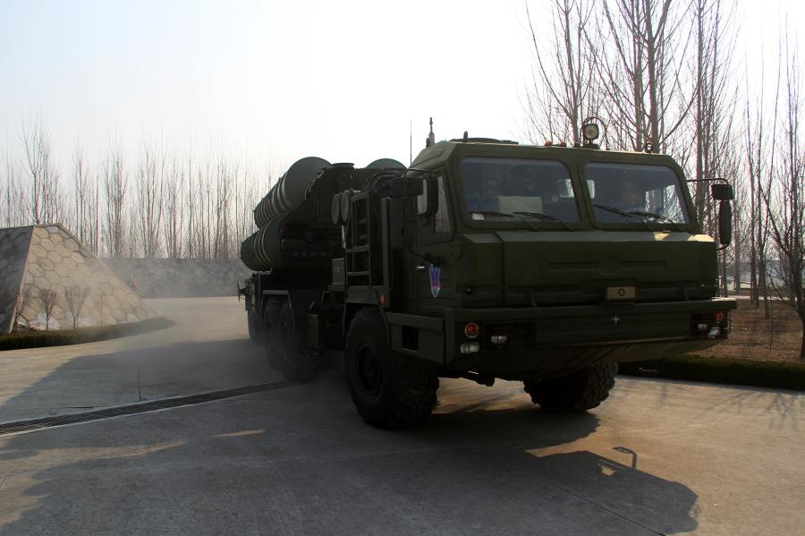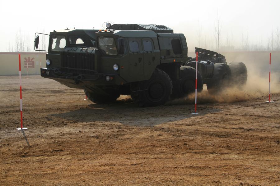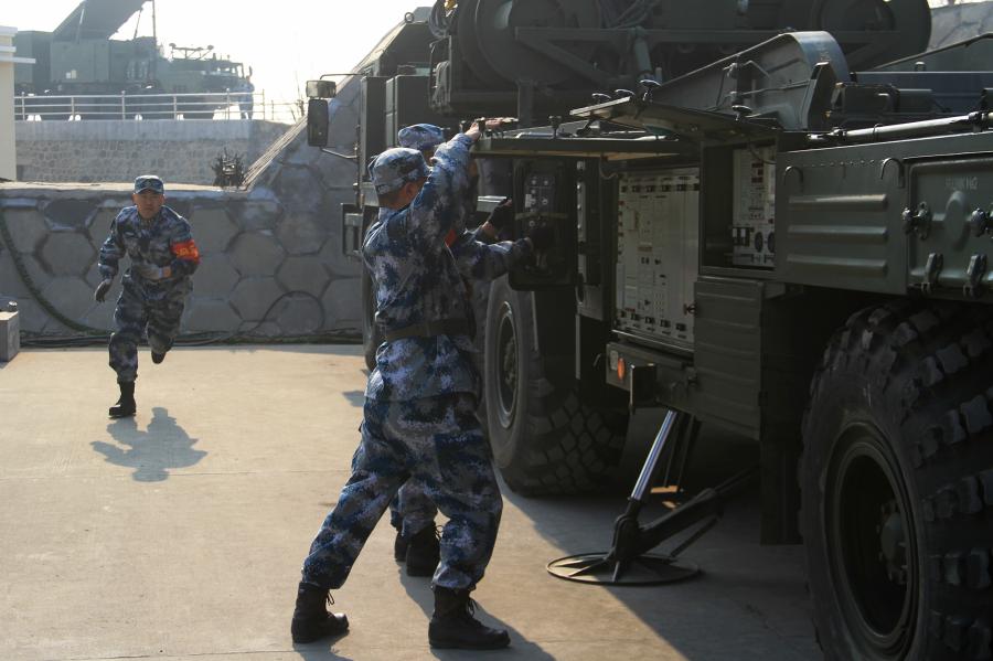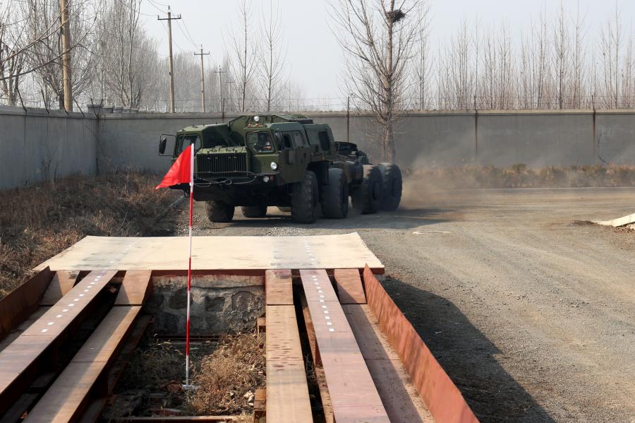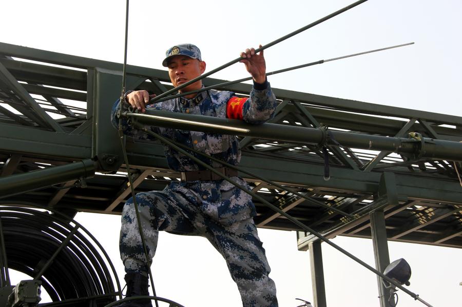 A soldier assigned to an air force missile brigade under the PLA Northern Theater Command is seen in the training of setting up a communication tower on a communication truck in mid-February, 2017. (81.cn/ Bo Xiangbo)