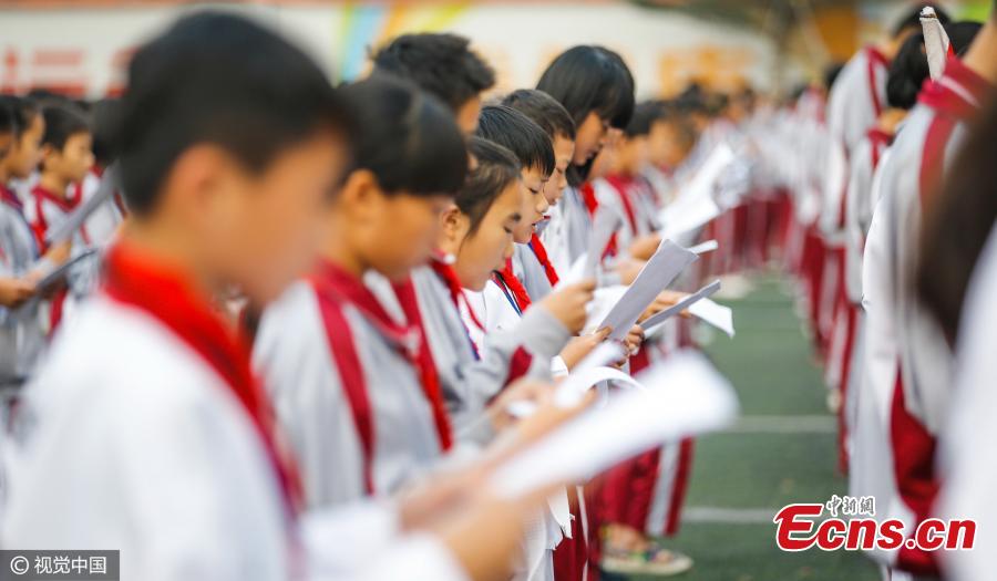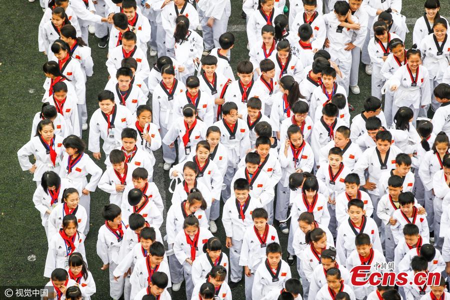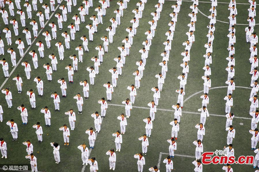 Students take part in an activity during recess at Chengxi Middle School in Haikou City, South China’s Hainan Province, on March 6, 2017. The group activity during class break includes taekwondo practice, reciting classical literature, learning etiquette, and a running session. (Photo/CFP)