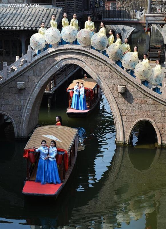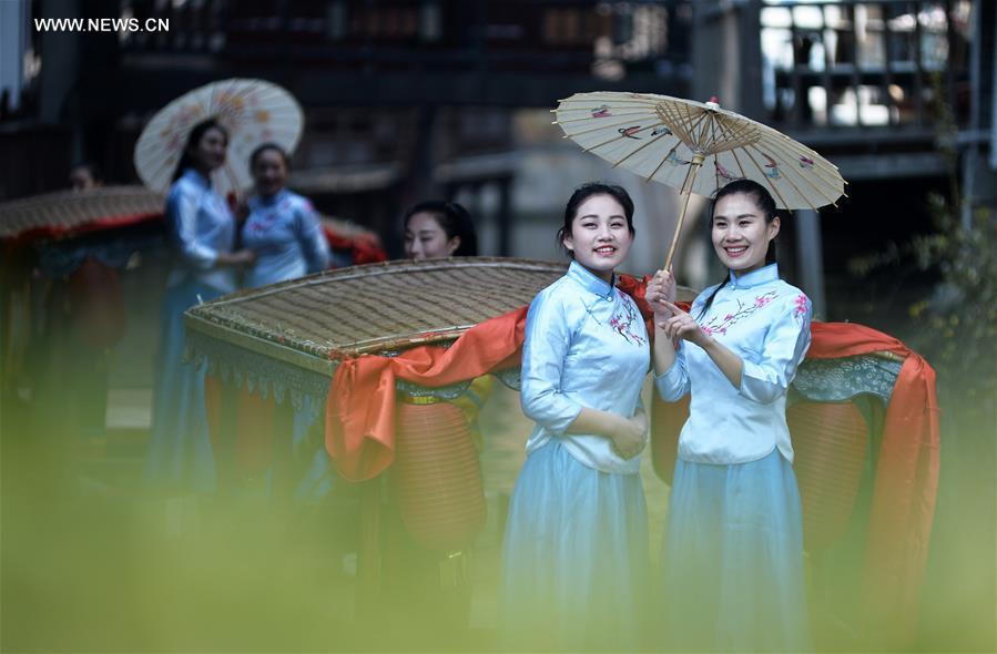 Service staff present their workwear at a fashion show in the scenic area of Tai'erzhuang ancient town, Zaozhuang City, east China's Shandong Province, March 7, 2017. (Xinhua/Gao Qimin)