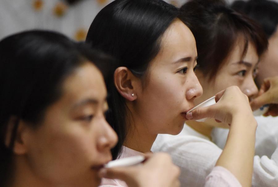Tea lover Zhang Haixia (left) exchanges her experiences in the tea rites with a partner at a ceremony in Hohhot, Inner Mongolia autonomous region, on March 7, 2017, to celebrate the International Women's Day. (Photo/Xinhua)