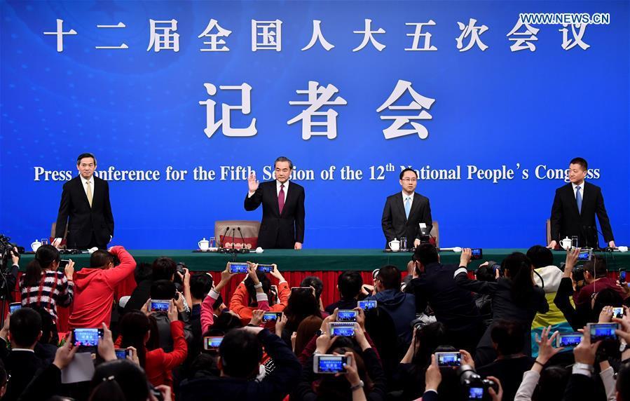Chinese Foreign Minister Wang Yi waves to media at a press conference on China's foreign policy and foreign relations for the fifth session of the 12th National People's Congress in Beijing, capital of China, March 8, 2017. (Xinhua/Xue Yubin)