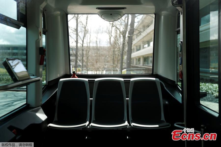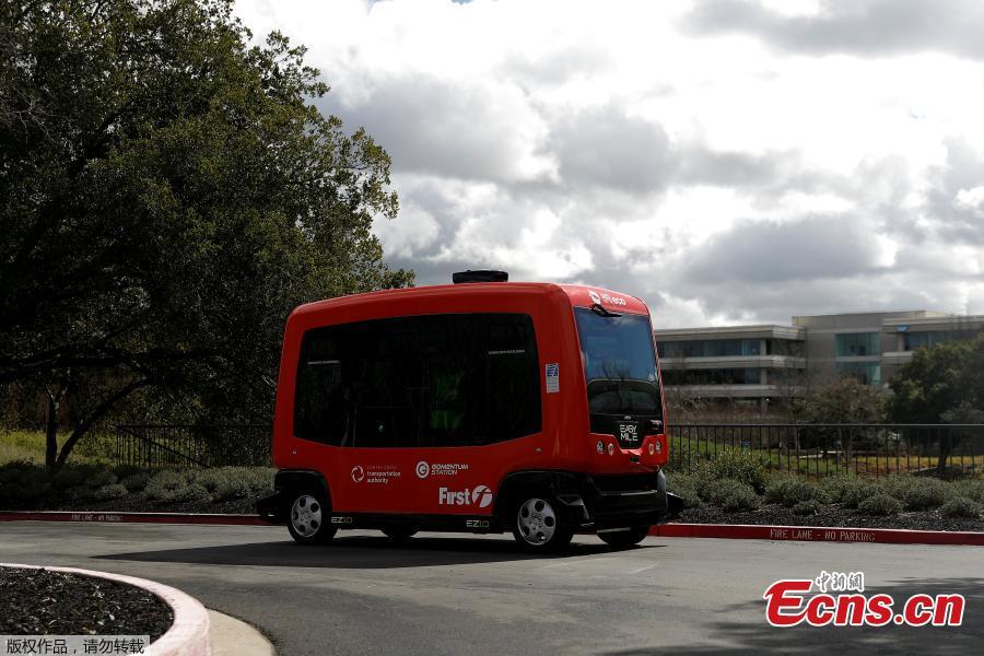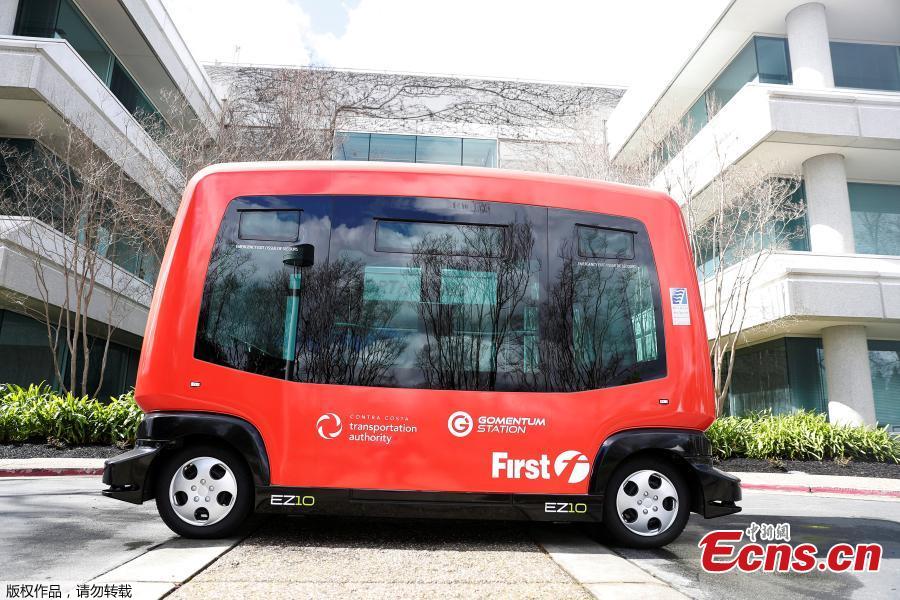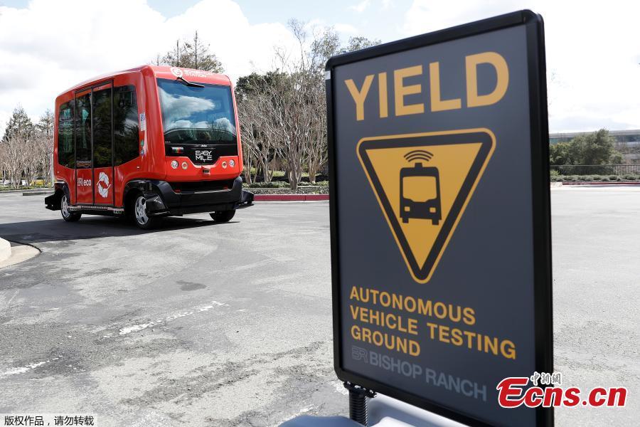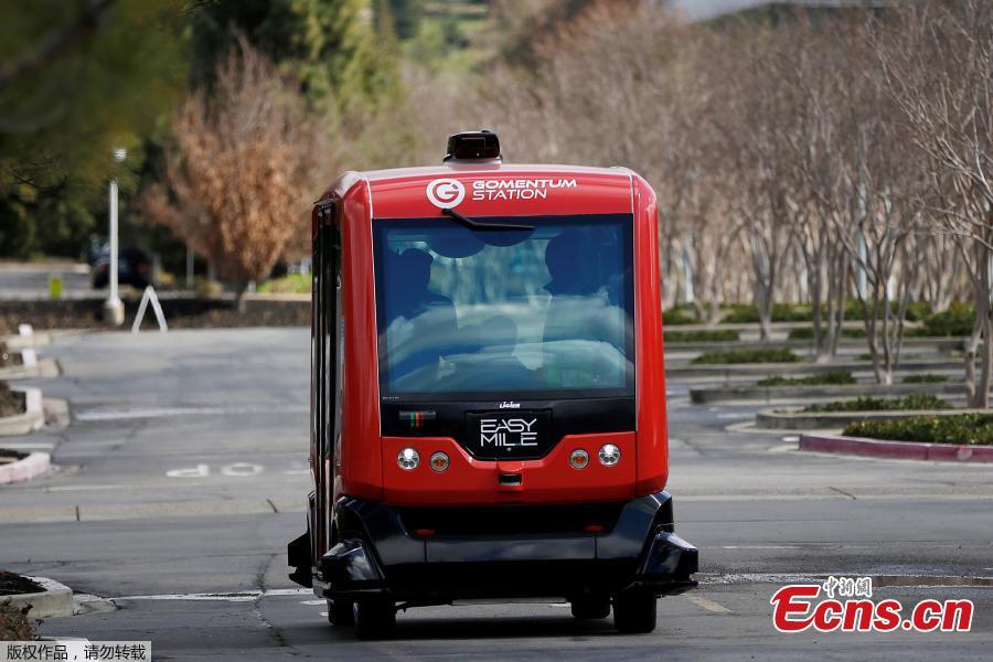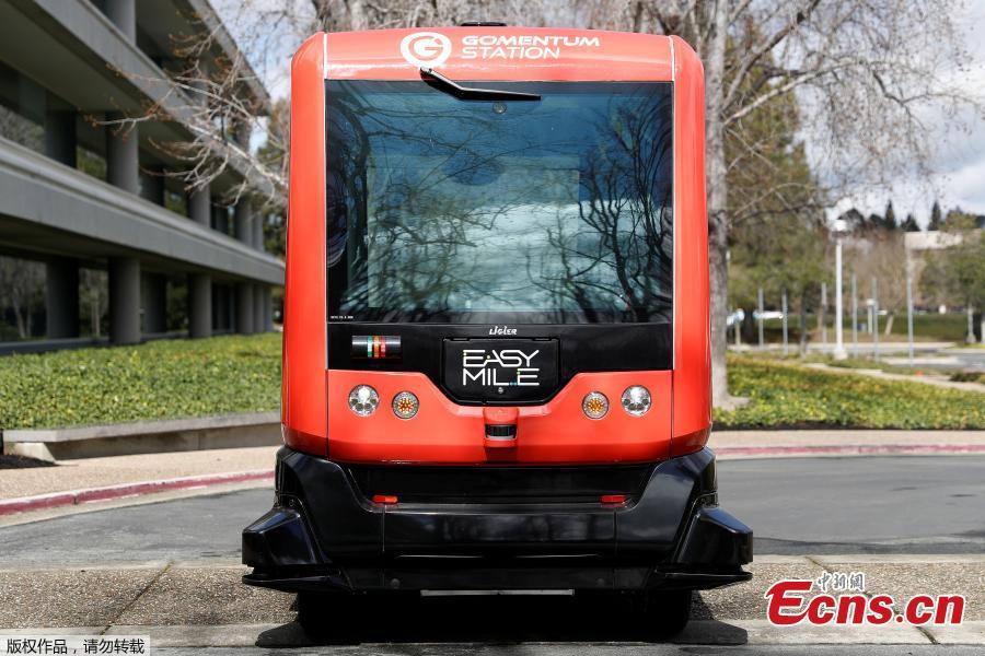 An EasyMile EZ10 shared autonomous vehicle is seen during a deployment demonstration at Bishop Ranch in San Ramon, California, March 6, 2017. A pair of $250,000 autonomous buses began driving around an empty San Francisco Bay Area parking lot on Monday, preparing to move onto a local public road in California's first pilot program for a self-driving vehicle without steering wheel or human operator. (Photo/Agencies)