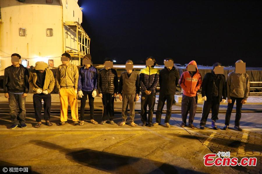 A boat suspected of transporting smuggled frozen meat is seized in waters near Shenzhen City, South China’s Guangdong Province. Guangdong coast guards found 600 tons of smuggled frozen meat and also caught 12 suspects. (Photo/CFP)