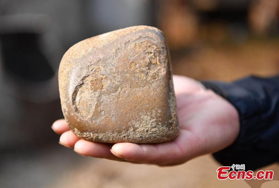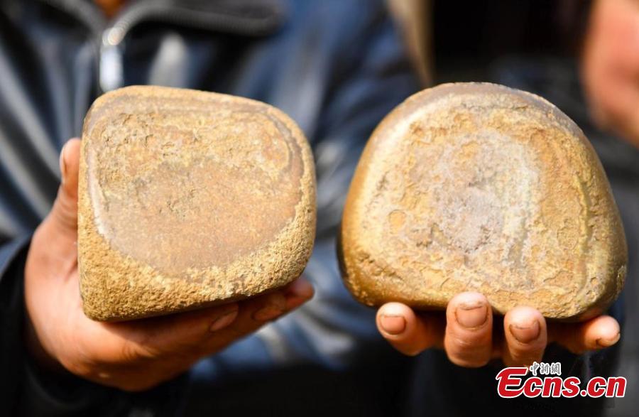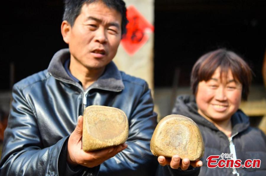Zhang Jisheng and his wife show stomach stones found in their dead horse at a village in Bozhou City, East China’s Anhui Province, March 7, 2017. The stones, or enterolith, are often called mabao, meaning “horse’s treasure” and used in traditional Chinese medicine. Zhang kept the horse for nearly 20 years and found three stones when he sold the horse meat. (Photo: China News Service/Liu Qinli)