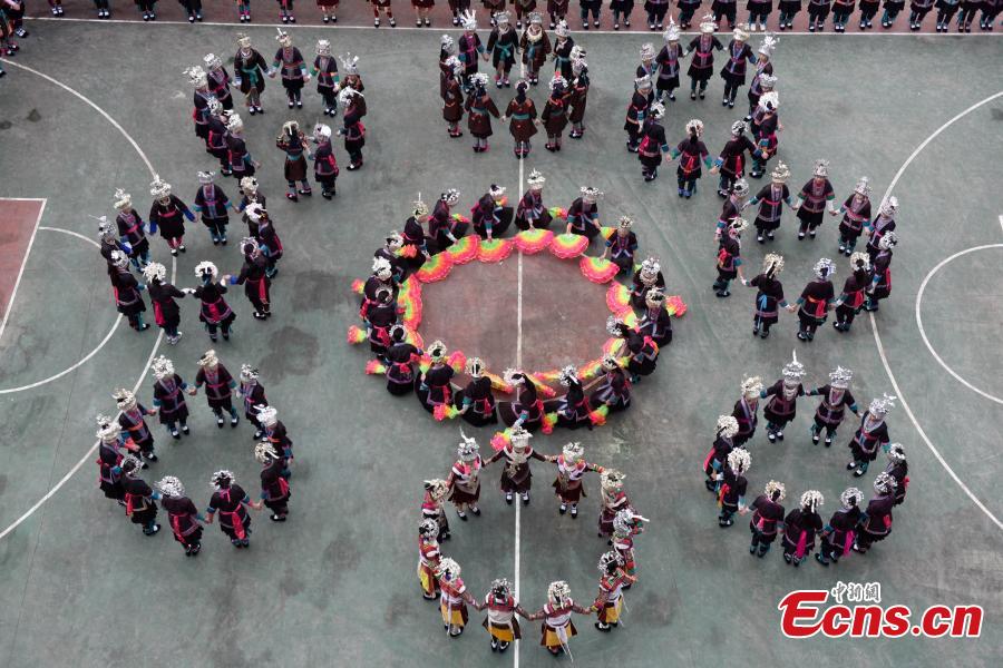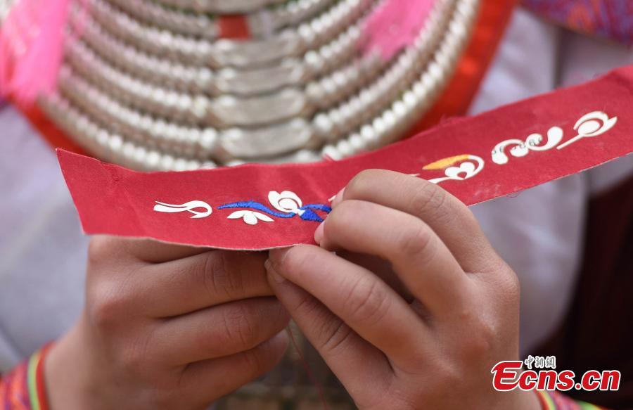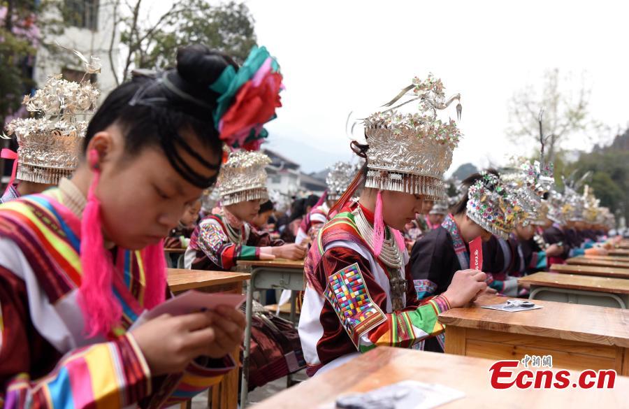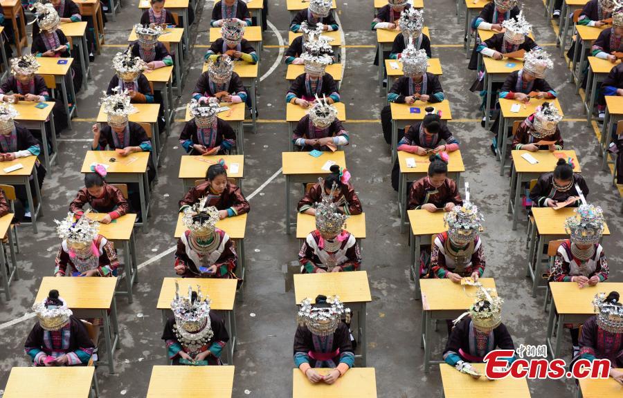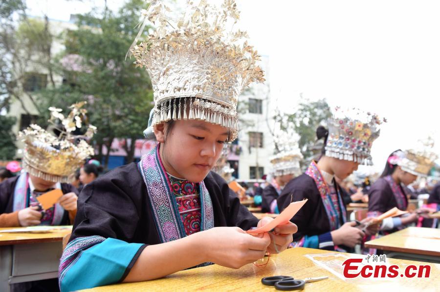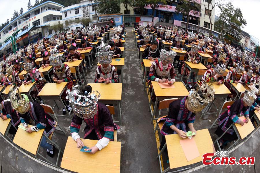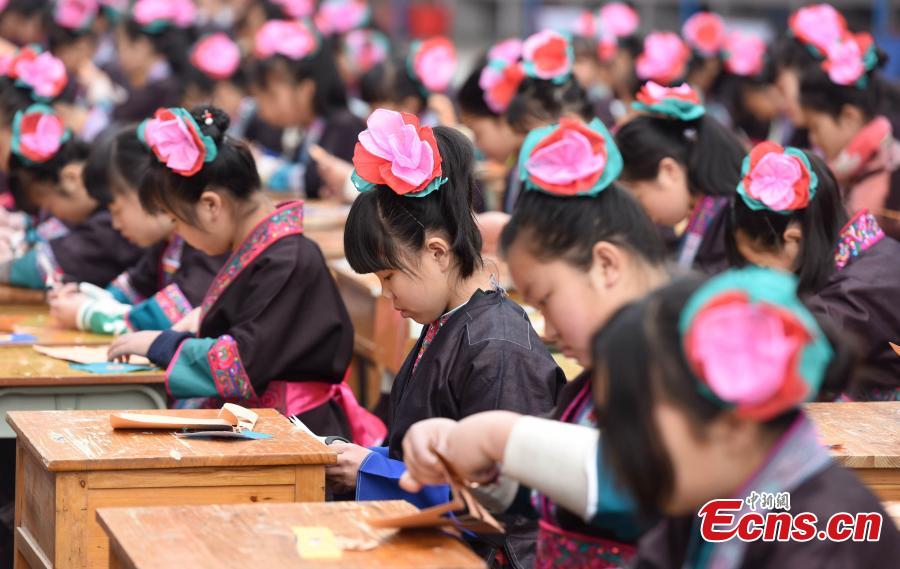 Students participate in a paper-cutting and embroidery contest at a middle school in Sanjiang Dong Autonomous County, South China’s Guangxi Zhuang Autonomous Region, March 8, 2017. More than 300 female students of Dong, Miao and Yao ethnic groups took part in the contest. (Photo: China News Service/Gong Pukang)