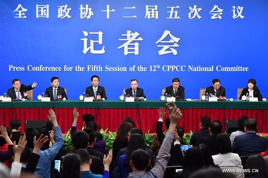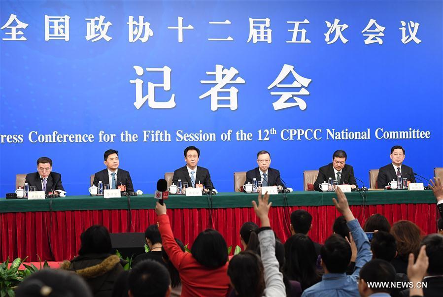 Members of the 12th National Committee of the Chinese People's Political Consultative Conference (CPPCC) Huang Jiefu (3rd R), Wang Wenbiao (2nd R), Xu Jiayin (3rd L), Hu Xiaoyi (R) and Li Yanhong (2nd L) wave to journalists at a press conference for the fifth session of the 12th CPPCC National Committee on benefiting the society and people in Beijing, capital of China, March 9, 2017. (Xinhua/Li Xin)