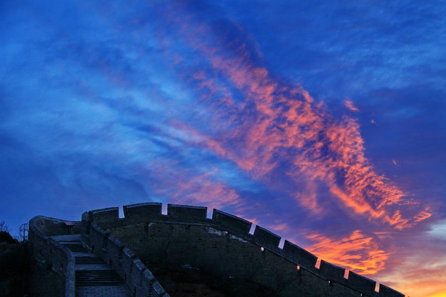 The fantastic sunset glows above the landmark General Building at the the Jinshanling Great Wall. (Photo/Official weibo account of Jiangshanling Great Wall)