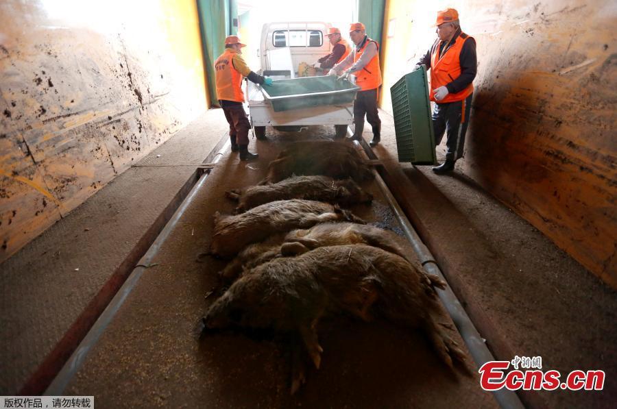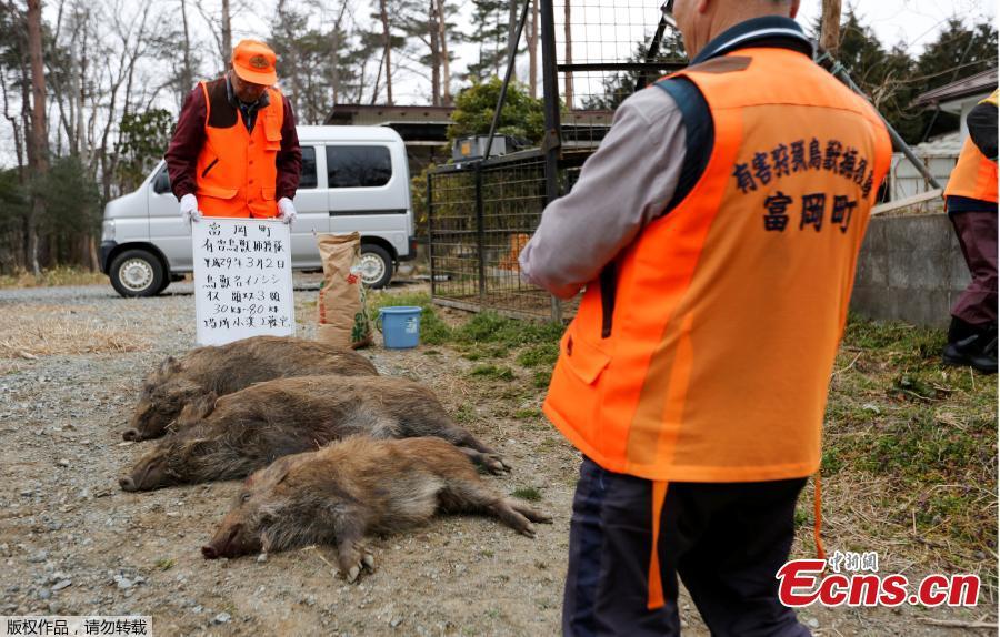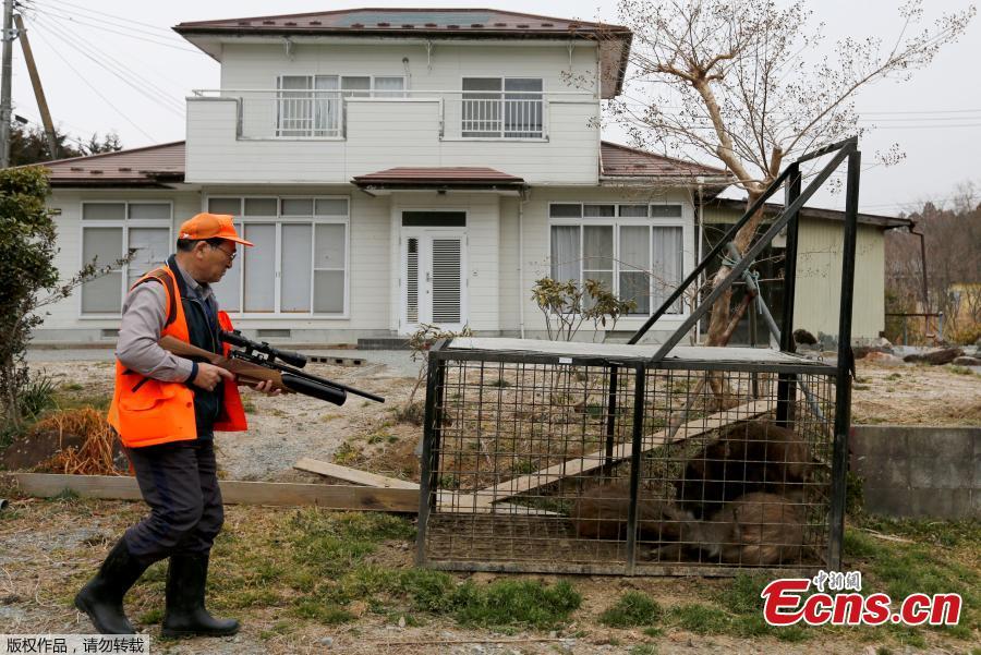 Wild boars are seen in a booby trap as a member of Tomioka Town's animal control hunters group, holds a pellet gun in Tomioka Town, Japan. Hundreds of toxic wild boars have been roaming across northern Japan, where the meltdown of the Fukushima nuclear plant six years ago forced thousands of residents to desert their homes, pets and livestock. As Japan prepares to lift some evacuation orders on four towns within the more than 12-mile exclusion zone around the Fukushima plant later this month, officials are struggling to clear out the contaminated boars. (Photo/Agencies)