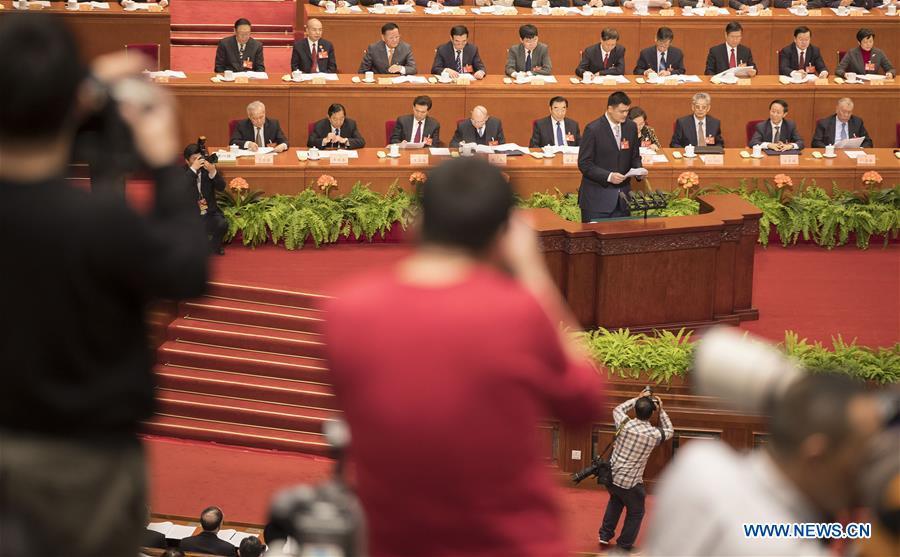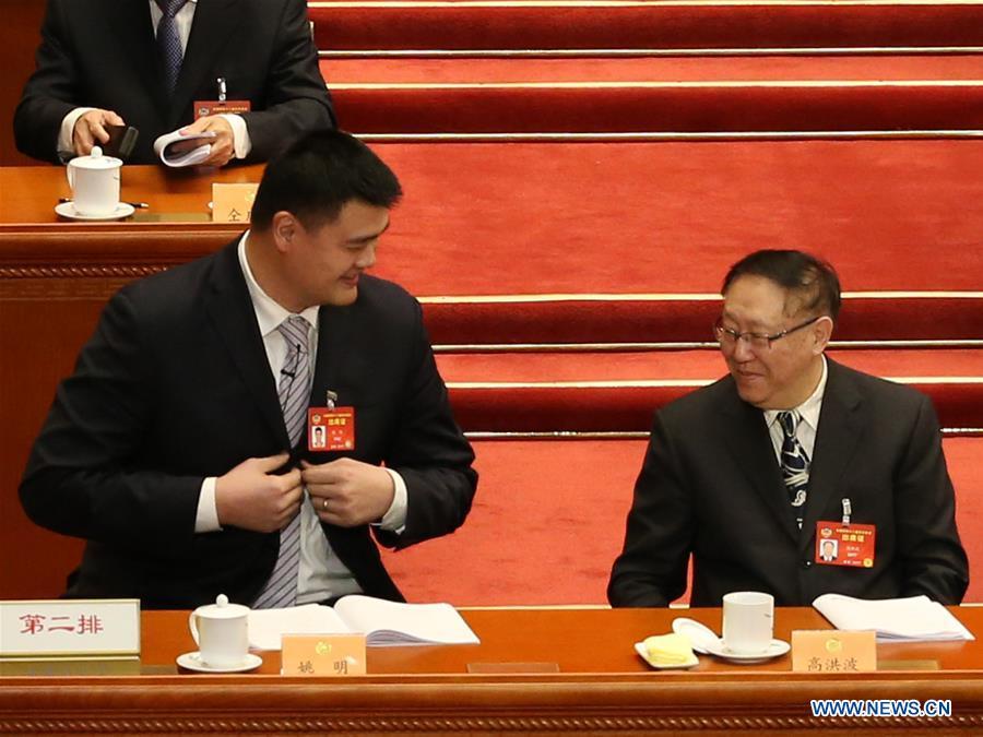 Yao Ming, a member of the 12th National Committee of the Chinese People's Political Consultative Conference (CPPCC), talks with other CPPCC National Committee members after the third plenary meeting of the fifth session of the 12th CPPCC National Committee in the Great Hall of the People in Beijing, capital of China, March 10, 2017. Political adviser Yao Ming urged the country to shift its sports focus from winning medals to cultivating a mature professional league system as China vows to become a strong sporting nation.(Xinhua/Zhang Yuwei)