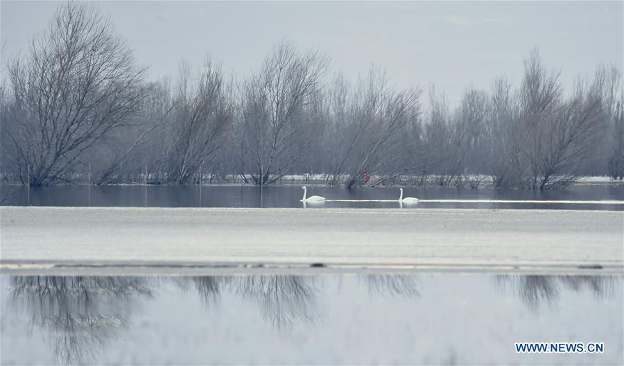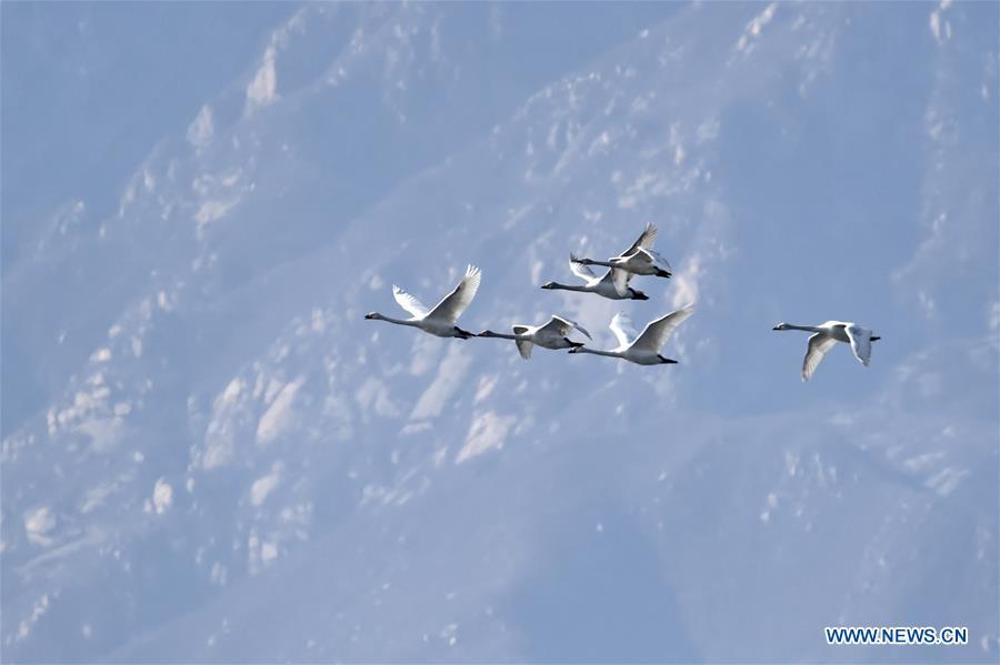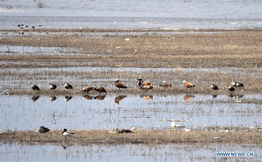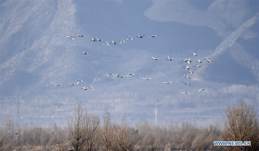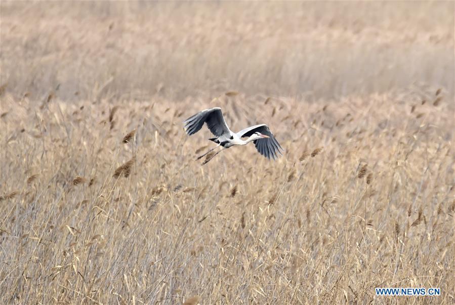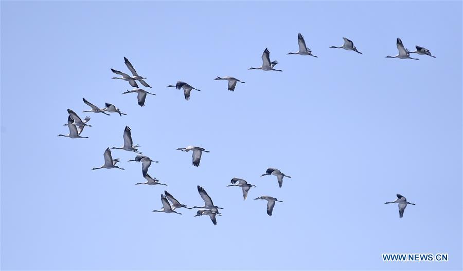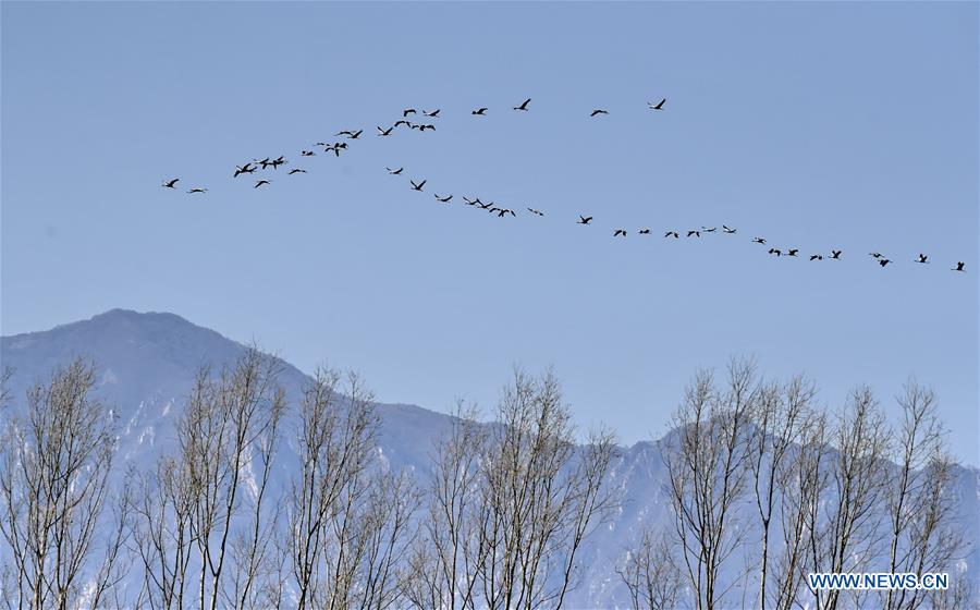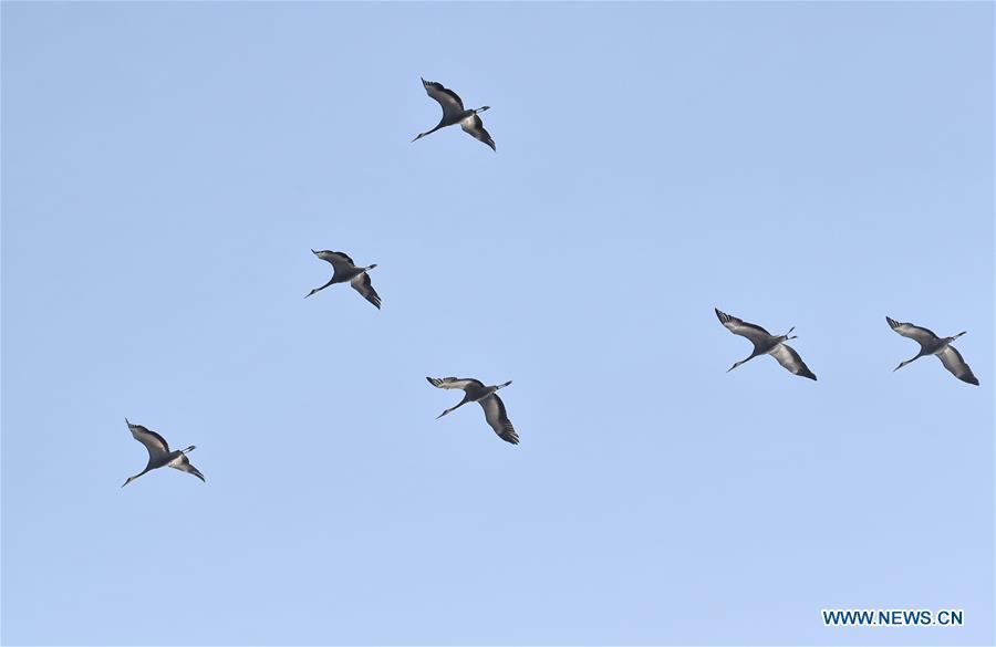 Grey cranes fly over a wetland by the Guanting reservoir in suburban Beijing, capital of China, March 11, 2017. Migratory birds passed by here and took a rest on their flyway to the north. (Xinhua/Li Xin)