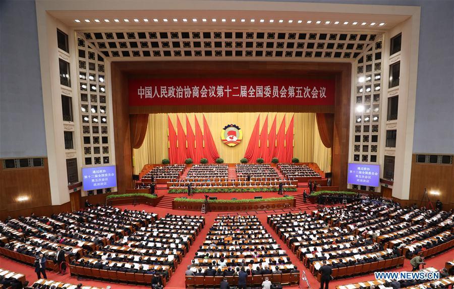 Yu Zhengsheng, chairman of the National Committee of the Chinese People's Political Consultative Conference (CPPCC), presides over the closing meeting of the fifth session of the 12th National Committee of the CPPCC at the Great Hall of the People in Beijing, capital of China, March 13, 2017. (Xinhua/Li Xueren)