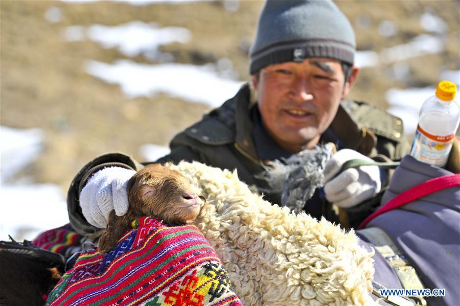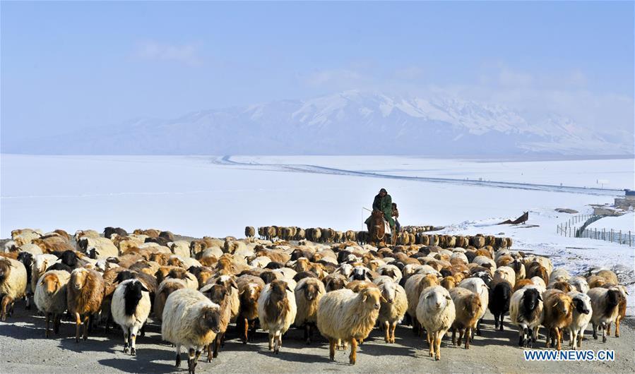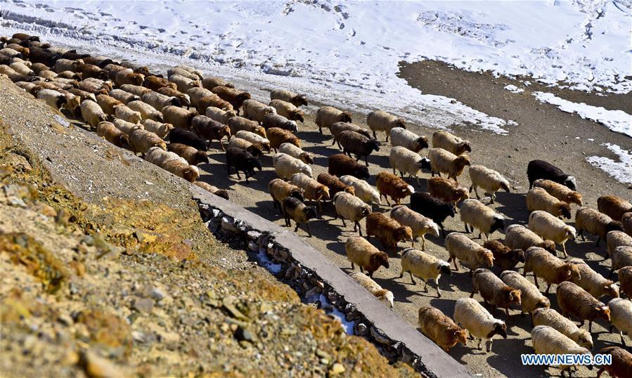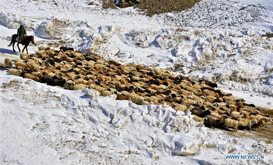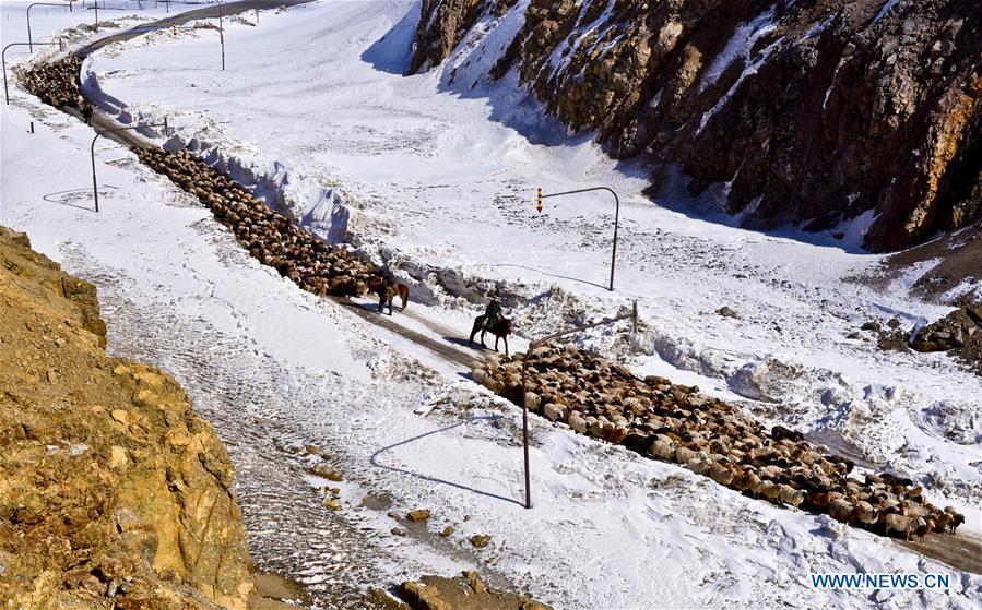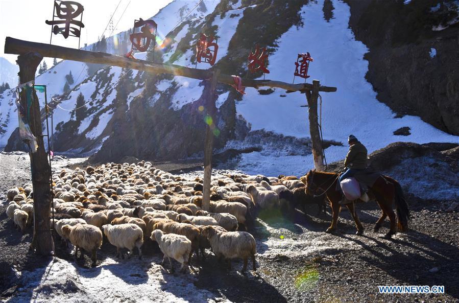 A herdsman transfers sheep to spring pastures in Ili Kazak Autonomous Prefecture, northwest China's Xinjiang Uygur Autonomous Region, March 9, 2017. Local herdsmen started to move their herds from winter pastures to spring pastures, as the weather grew warm. (Xinhua/Hu Huhu)