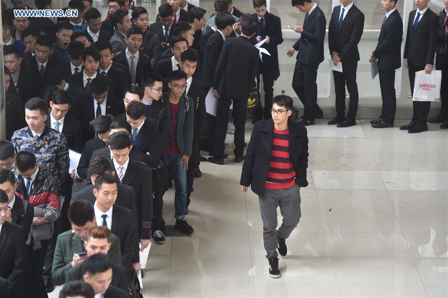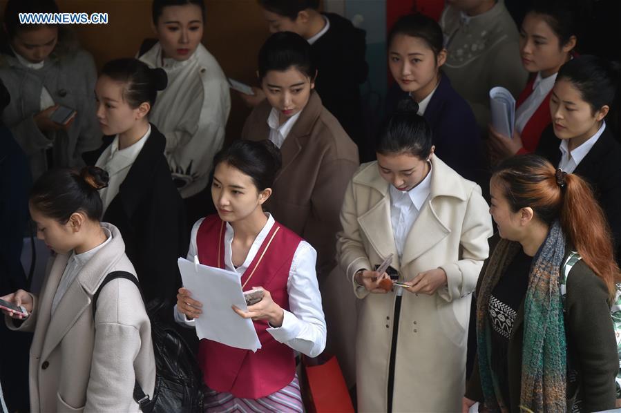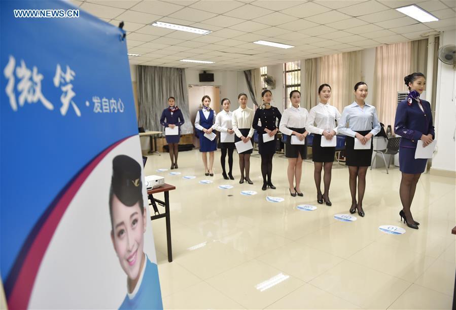 Students take part in a recruitment test of Xiamen Airlines at Fuzhou University in Fuzhou, capital of southeast China's Fujian Province, March 12, 2017. Xiamen Airlines started the recruitment exam for flight attendants at the university on Sunday. (Xinhua/Song Weiwei)