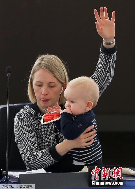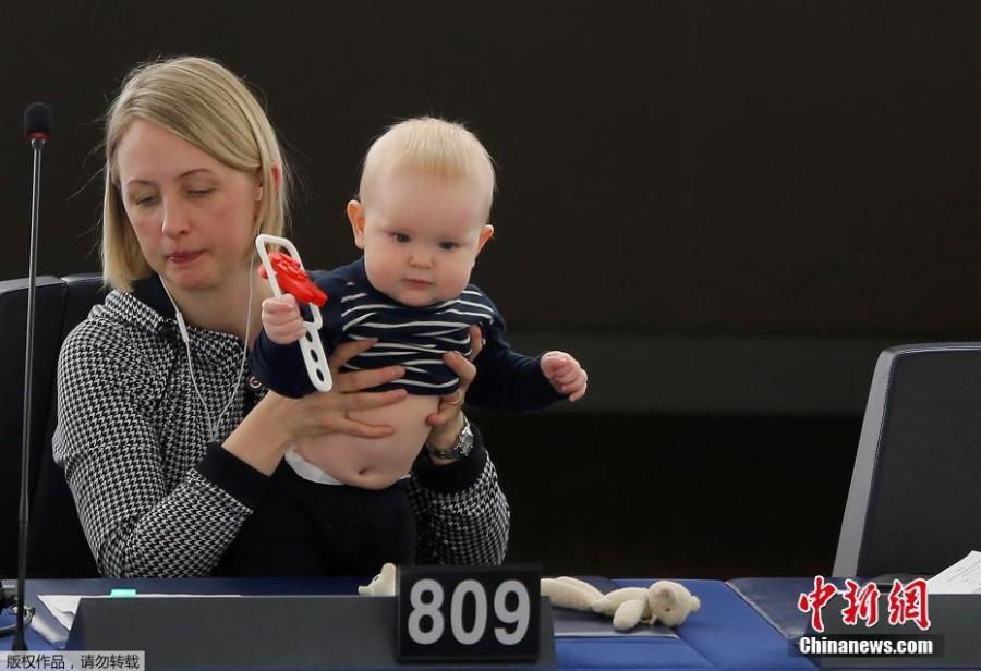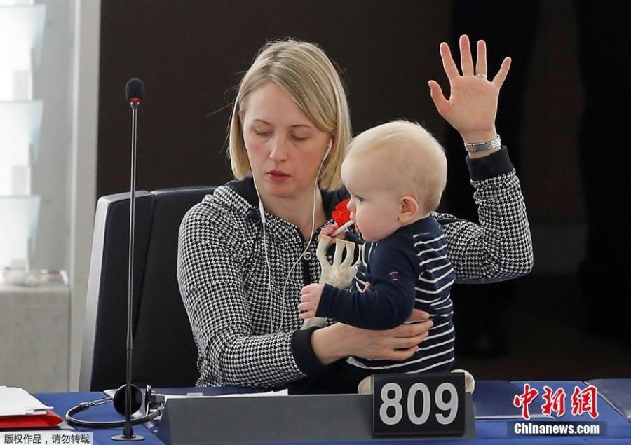 Swedish Member of the European Parliament Jytte Guteland holds her baby as she takes part in a voting session at the European Parliament in Strasbourg, France, March 14, 2017. (Photo/Agencies)