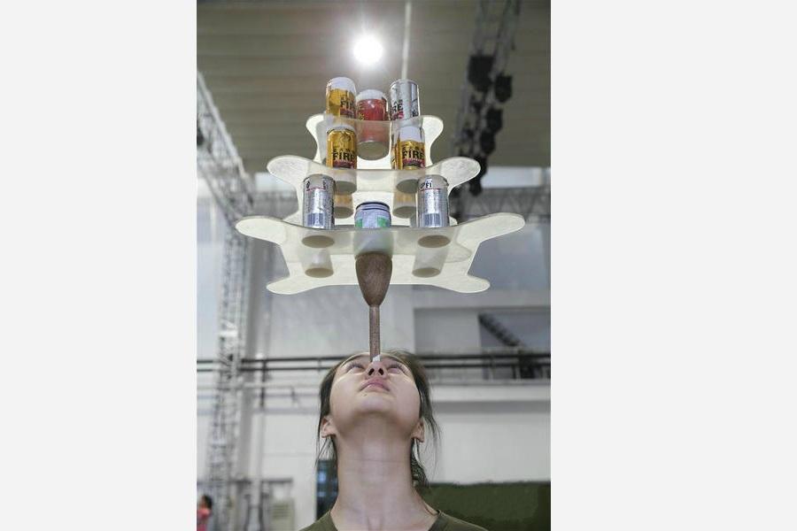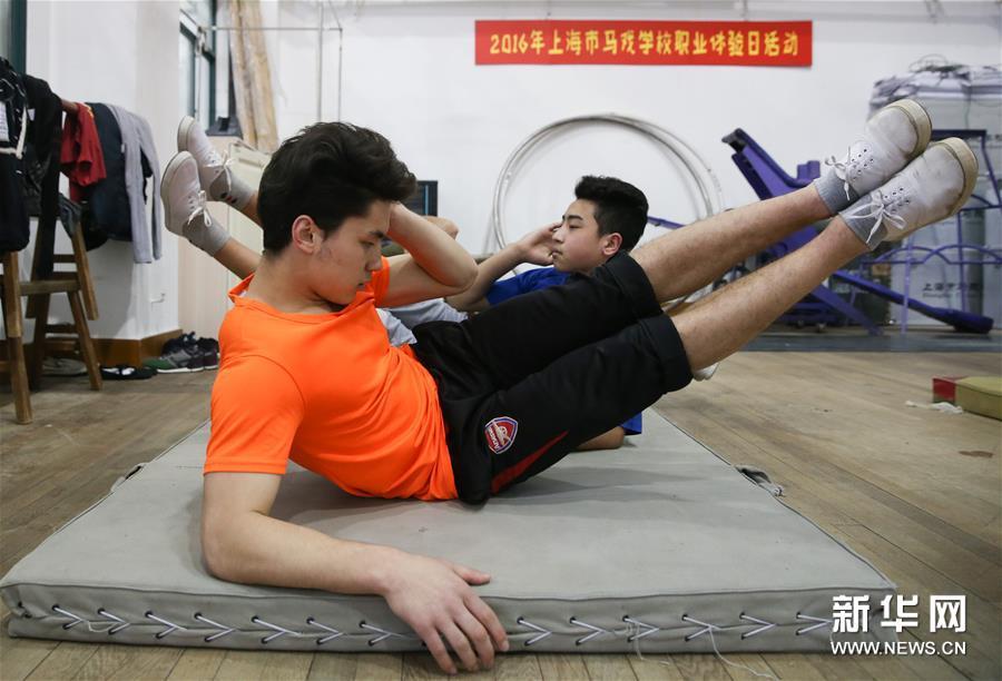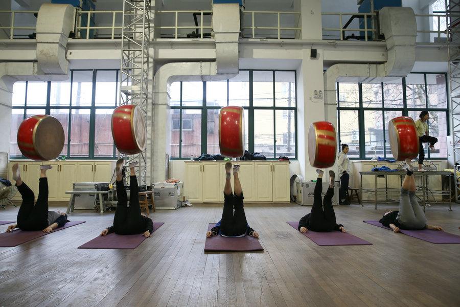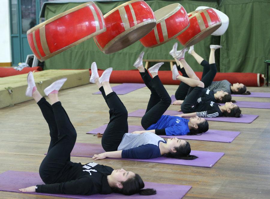 Students from Xinjiang practice rolling big drums with their feet at Shanghai Circus School, March 13, 2017. (Photo/Xinhua)