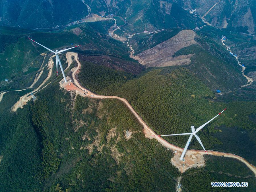 Photo taken on March 15, 2017 shows a wind turbine farm on the hills of Changxing County, east China's Zhejiang Province. A total of 11 wind turbines of a power plant officially began to join the power grid on Wednesday. (Xinhua/Xu Yu)