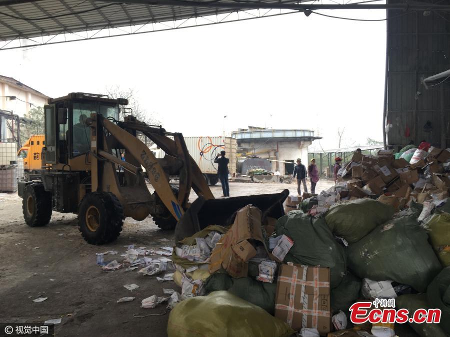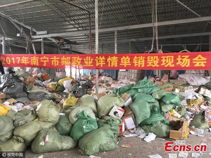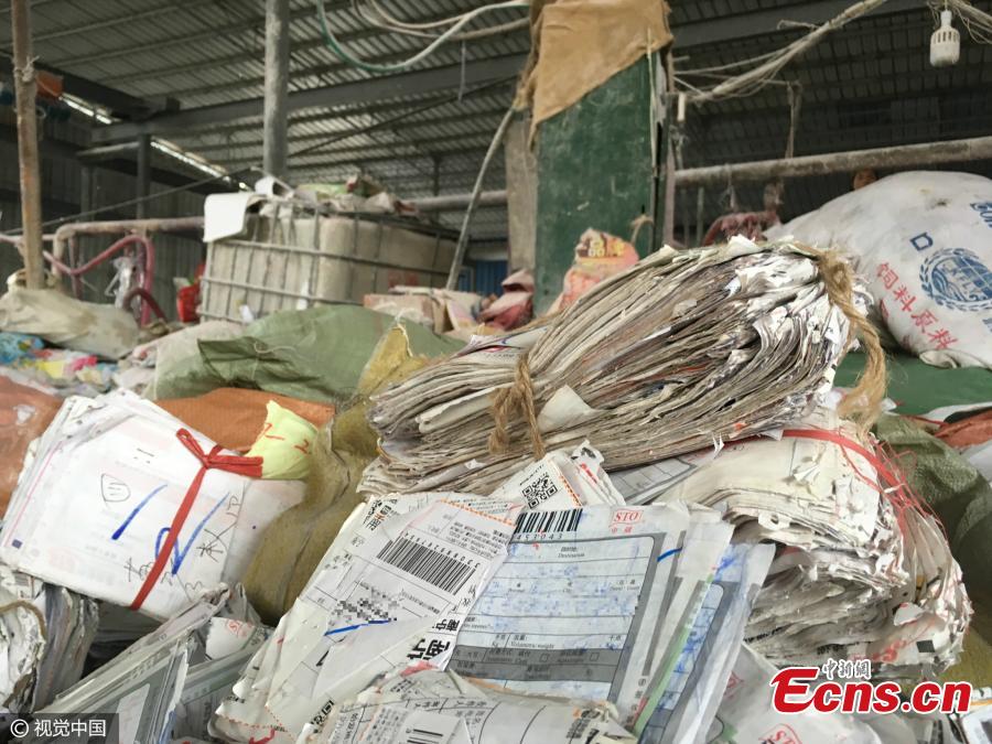 Piles of courier receipts are destroyed in Nanning City, the capital of South China’s Guangxi Zhuang Autonomous Region, March 15, 2017, also Consumer Rights Day. Chinese logistic firms are required to keep the courier receipts of customers for one year before destroying them after in order to protect the personal data of clients. Nearly 300 million receipts, weighing about 35 tons, were destroyed and processed to become agricultural paper in Nanning. (Photo/CFP)