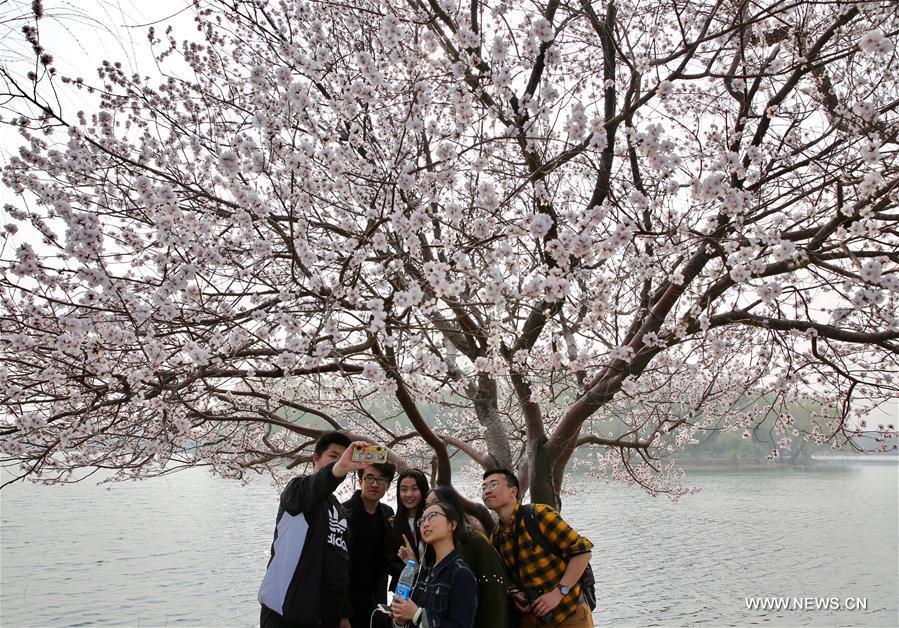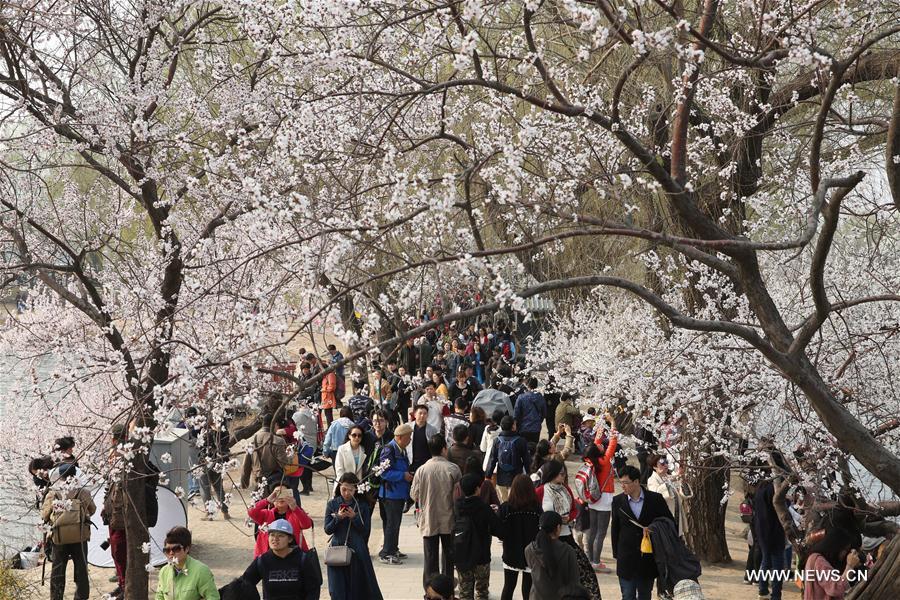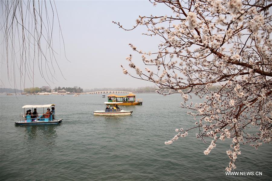 Visitors view the flowers in the Summer Palace in Beijing, capital of China, March 18, 2017. (Xinhua/Jin Liwang)