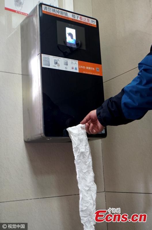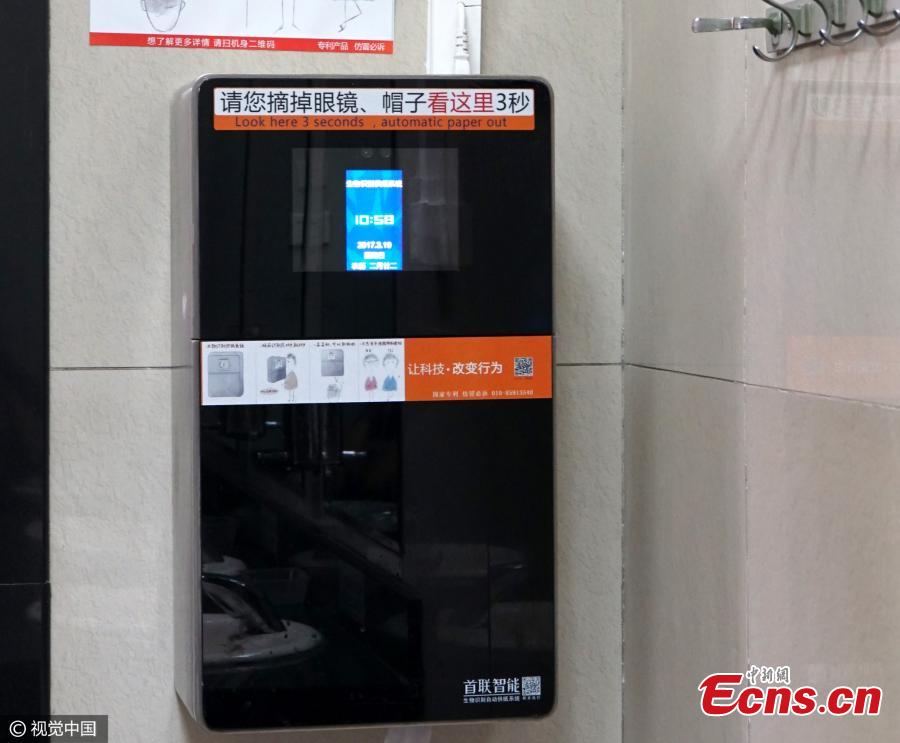 A machine on the wall requires people to scan their faces first before they can get free toilet paper in Tiantan Park, Beijing, March 19, 2017. Tiantan Park, home to the iconic Temple of Heaven, used the machine to prevent users from raiding the park's restrooms for toilet paper. The software will deny the same person toilet paper within nine minutes of their first scan. (Photo/CFP)