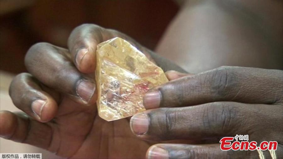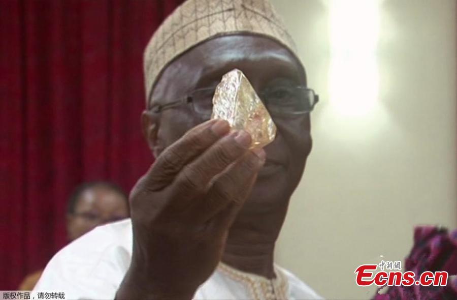 In this photo taken from video footage, Sierra Leone's Minister of Mines and Mineral Resources Alhaji Minkailu Mansaray hands a diamond during a meeting with delegates of Kono district, where the 706-carat gem was found, at the presidential office in Freetown, Sierra Leone, March 16, 2017. A pastor in Sierra Leone has discovered the largest uncut diamond found in more than four decades in this West African country and has turned it over to the government, saying he hopes it helps to boost recent development in his impoverished nation. (Photo/Agencies)