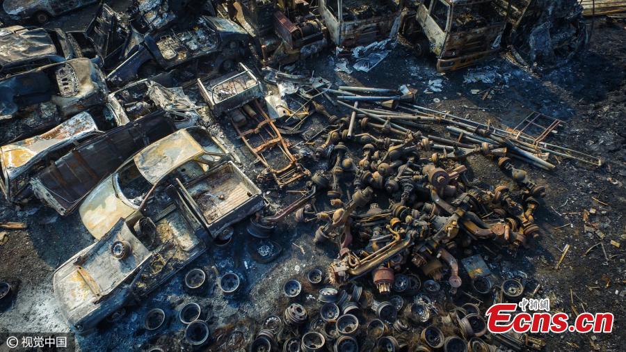 Burnt-out cars are seen at a parking lot in Haikou City, South China’s Hainan Province, March 2, 2017. More than 6,000 scrap cars on the parking lot were destroyed in a fire that lasted about seven hours. No casualties were reported. (Photo/CFP)