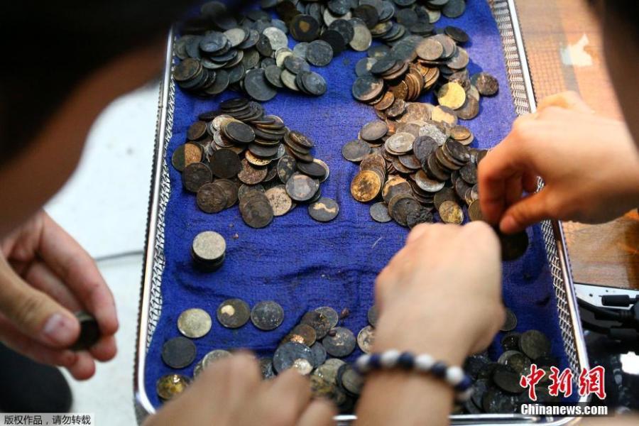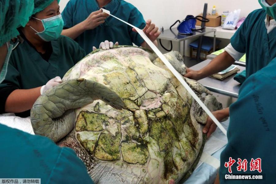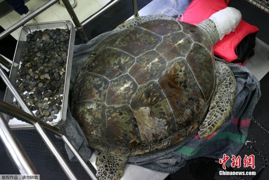 Omsin, a 25-year-old female green sea turtle, rests next to a tray of coins that were removed from her stomach at the Faculty of Veterinary Science, Chulalongkorn University in Bangkok, Thailand, March 6, 2017. The endangered green sea turtle named “Piggy Bank” has died just weeks after undergoing a surgery to remove 915 coins from her stomach. Doctors said the turtle had been suffering from intestinal problems after the operation. (Photo/Agencies)