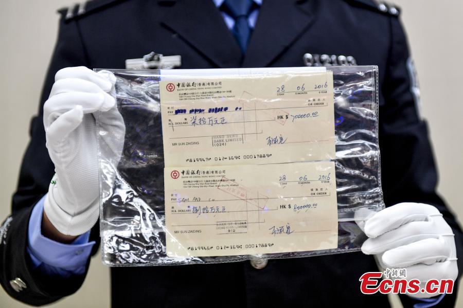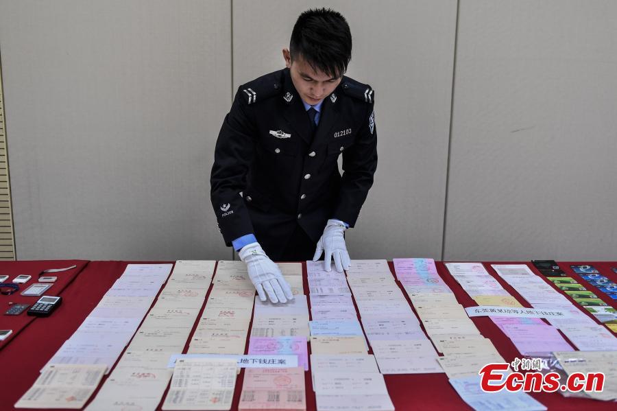 A police officer shows banknotes seized in a campaign against underground banking in Guangzhou City, South China’s Guangdong Province, March 21, 2017. Guangdong police said they had busted 20 cases of underground banking involving transactions totaling 46 billion yuan ($6.7 billion) and detained more than 70 suspects. (Photo: China News Service/Chen Jimin)