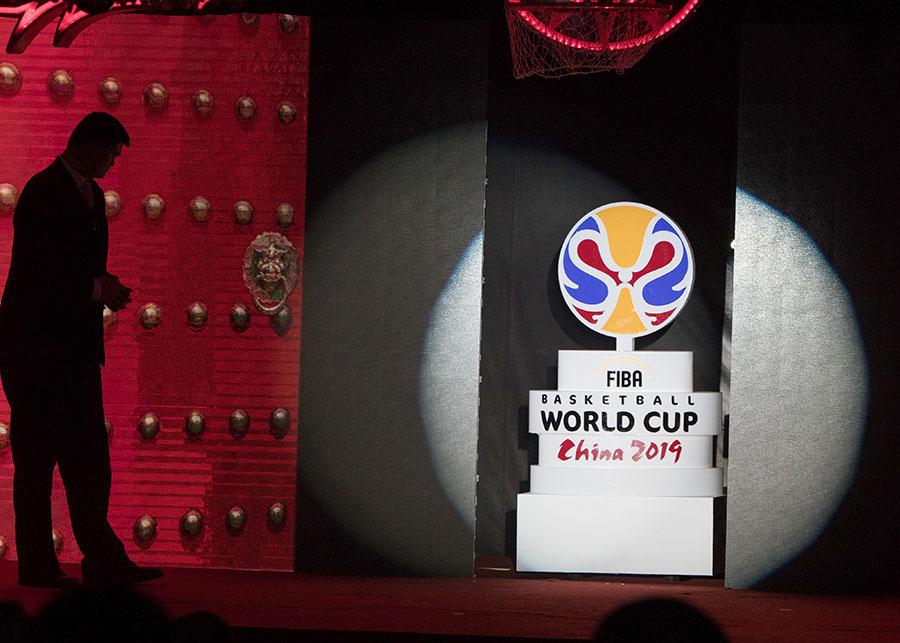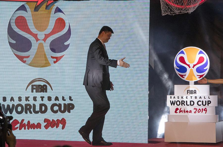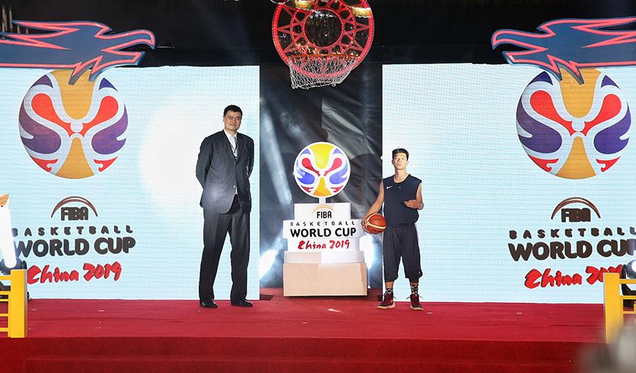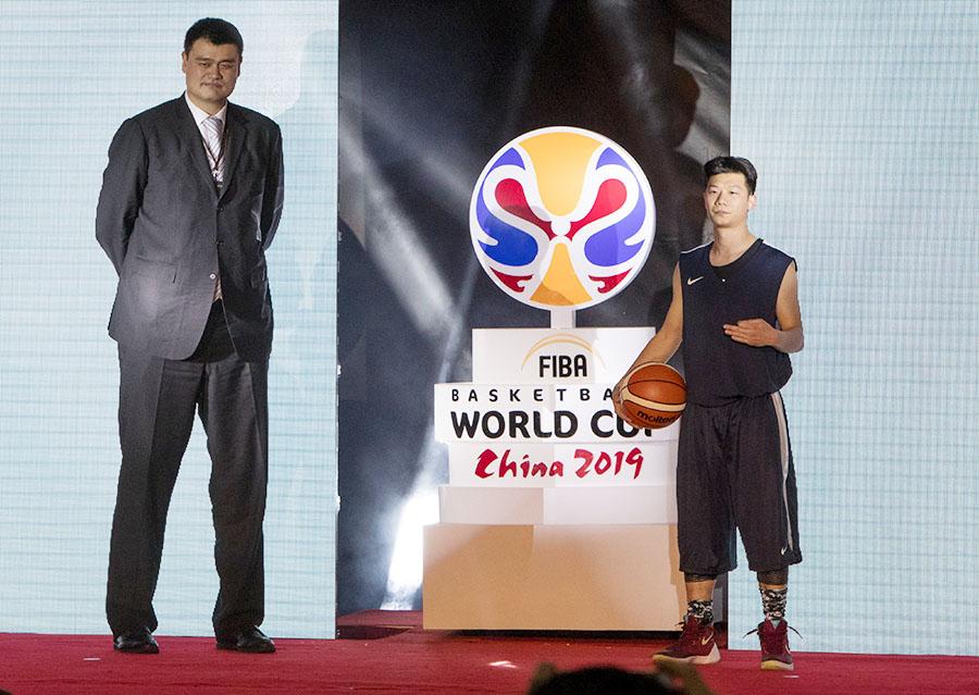 Chairman of Chinese Basketball Association Yao Ming (left) and amateur basketball player Zhang Yechi unveil the emblem of the 2019 FIBA Basketball World Cup in Shanghai on March 21, 2017. China will host the tournament for the first time in 2019 in eight cities across the country. (Photo by Gao Erqiang/China Daily)