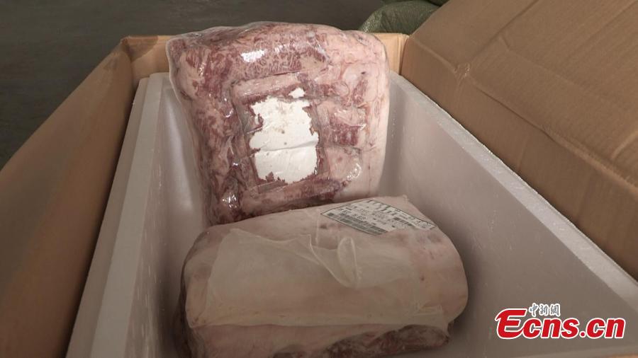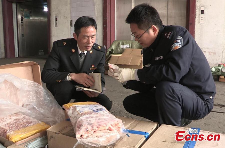 Customs officers show frozen meat seized in Hangzhou City, the capital of East China’s Zhejiang Province. After six months’ investigation, local customs busted a ring involved in smuggling more than 8,000 tons of frozen beef and other by-products worth 87 million yuan ($12.6 million). (Photo: China News Service/Yang Wei)