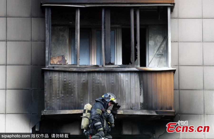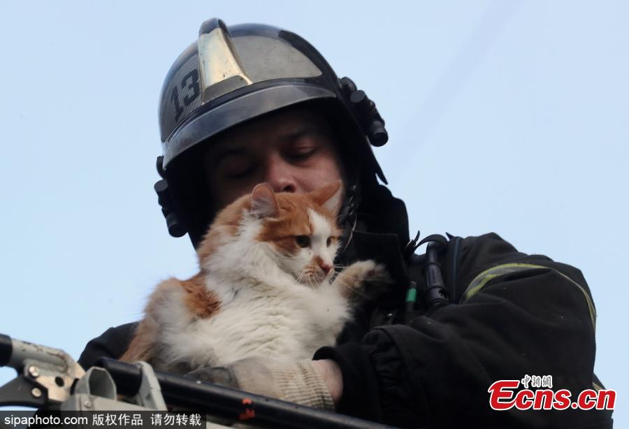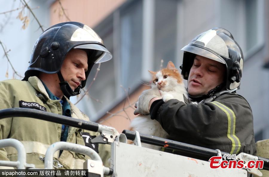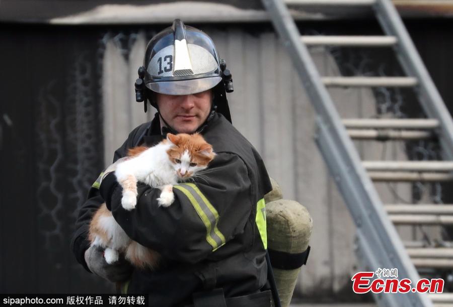 A firefighter rescues a cat from a fire caused by a domestic gas explosion in an apartment block in Moscow's Izumrudnaya Street on March 22, 2017. (Photo/Sipachina)