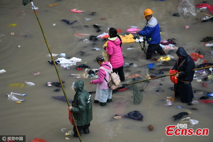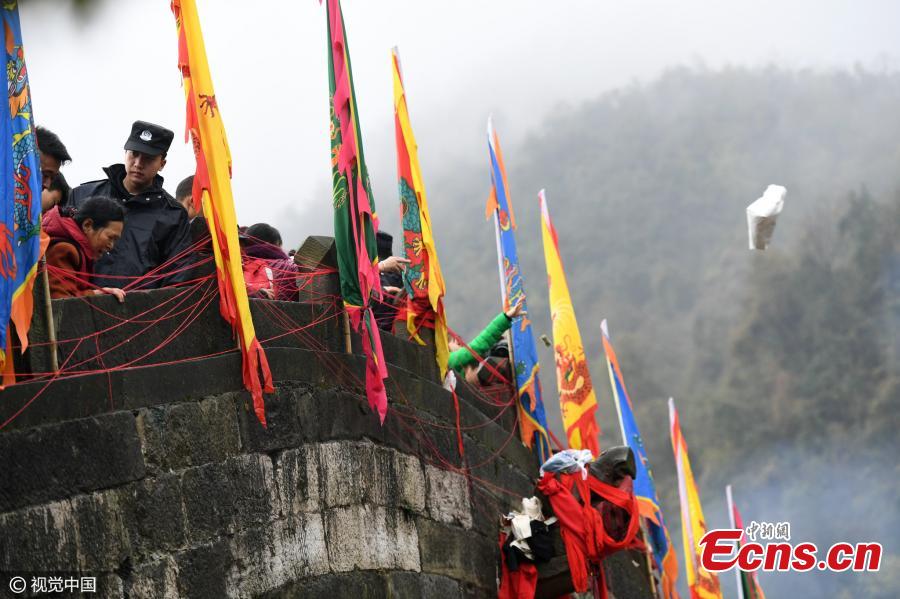 People try to catch banknotes thrown away by revelers on a bridge during a folk festival in Jushui Town, Mianyang City, Southwest China’s Sichuan Province, March 22, 2017. In the festival, people throw away used clothes or small change from the 200-year-old stone bridge into the river, wishing to rid themselves of bad luck. More than 100,000 devotees attended this year’s festival. (Photo/CFP)
