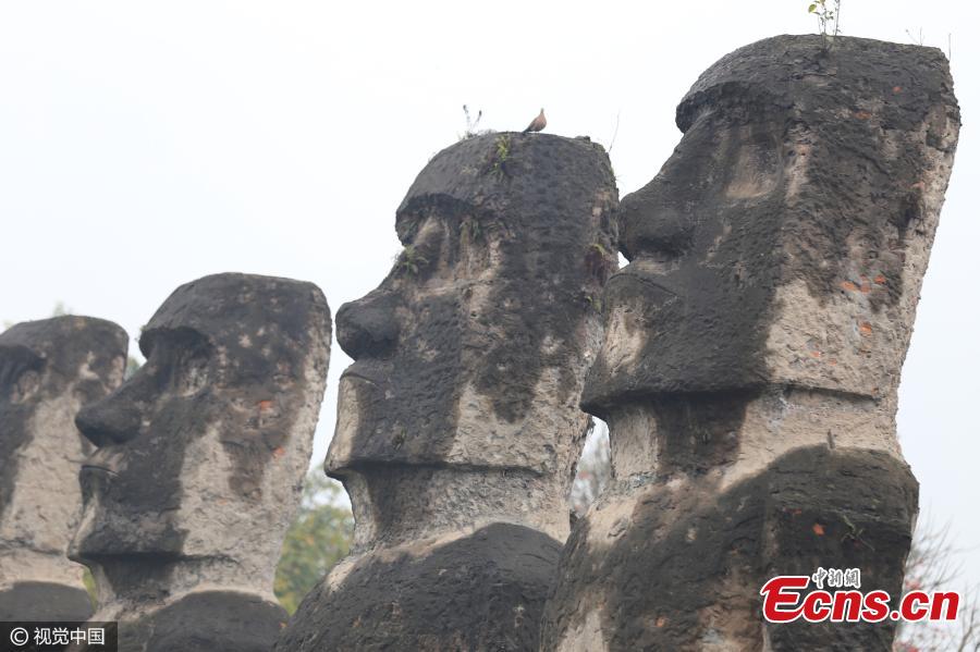 Statues that look like the moai statues of Easter Island at a campus in Chengdu City, the capital of Southwest China’s Sichuan Province, March 22, 2017. (Photo/CFP)