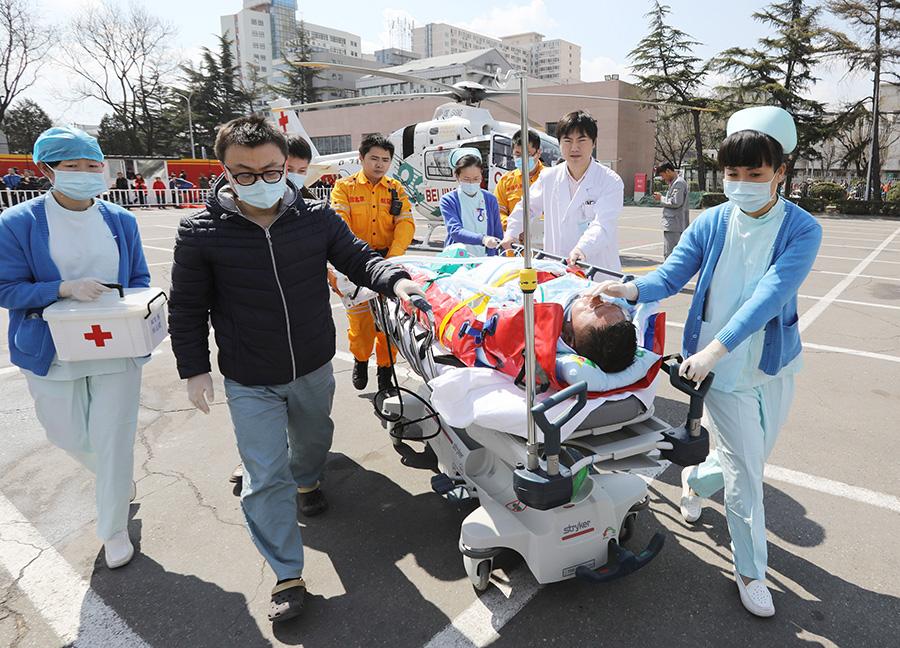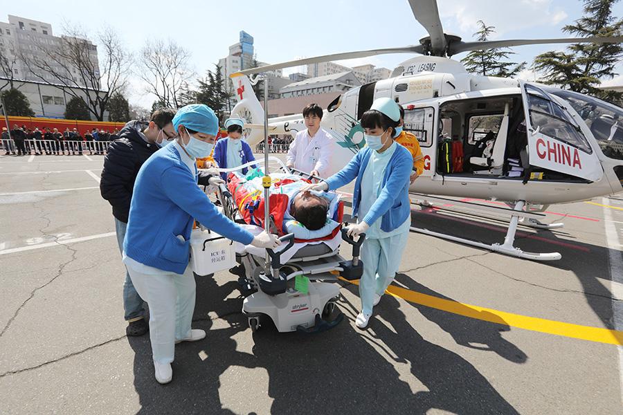 A 35-year old man suffering from critical respiratory disease was transferred from Hengshui city, North China's Hebei province, via medical rescue helicopter of the Beijing Red Cross Foundation to the China-Japan Friendship hospital in Beijing on March 26. It is the hospital's second medical rescue movement for critical patients since it introduced a helicopter medical rescue team in 2016.