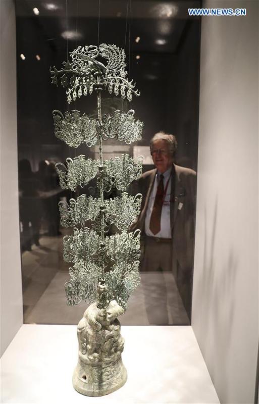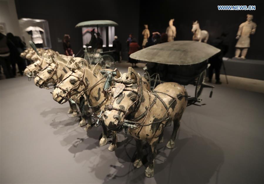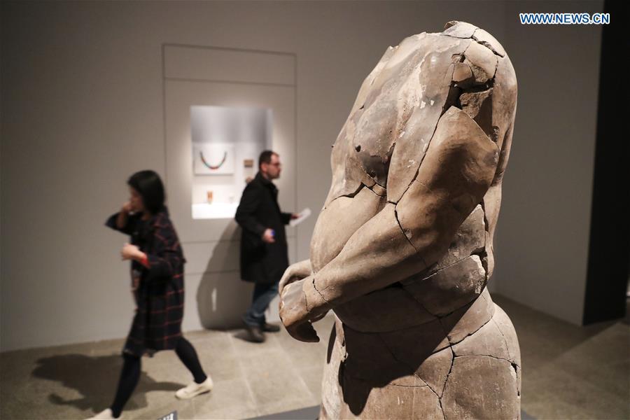 A visitor walks past an earthenware named "Female Dancer" during a media preview of the Exhibition of Civilization of the Qin and Han Dynasties (221 B.C.-220 A.D.) in The Metropolitan Museum of Art, New York, the United States. The exhibition featuring more than 160 objects of ancient Chinese art, will be opened to public from April 3 to July 16 in The Metropolitan Museum of Art. (Xinhua/Wang Ying)