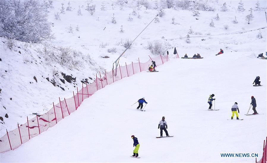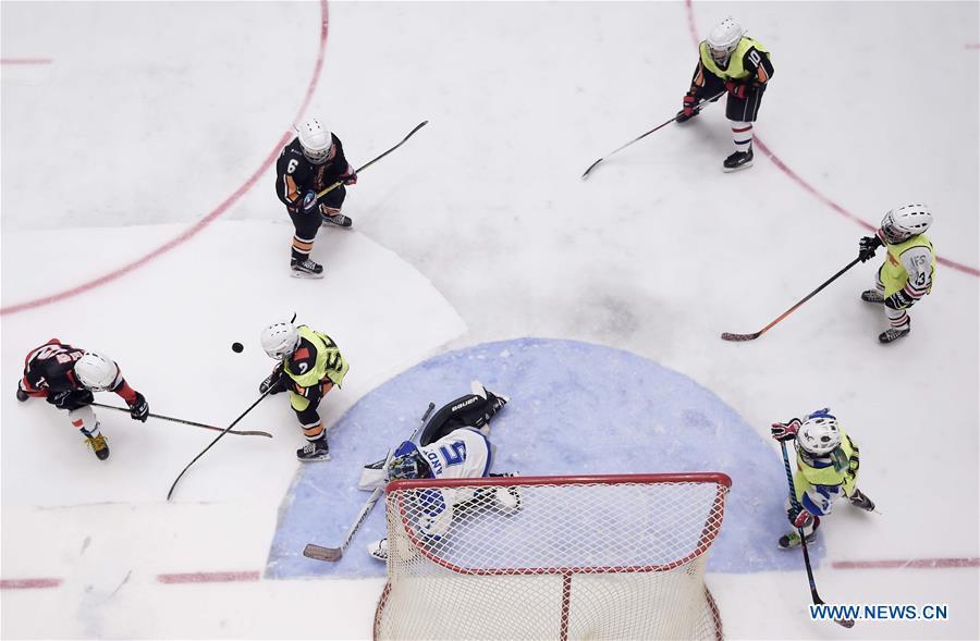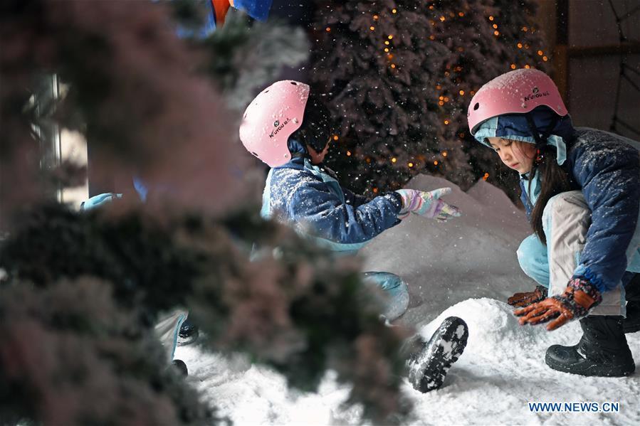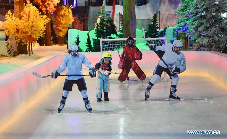 A girl plays ice hockey in "Snow Wonder Land" at an oulet mall in Changsha, capital of central China's Hunan Province, on Feb. 25, 2017. With the benefit of Beijing winning the bid to host the 2022 Winter Olympics and Chinese government targeting attracting 300 million Chinese to participate in winter sports, the authorities of Hunan province takes winter sports industry more and more seriously and put it into the "the five-year plan"(from 2016 to 2020). A series of venues of winter sports for public are under construction, some of which have already opened. A total of eight removable ice rinks will be built in the cities like Binzhou, Huaihua, Xiangtan and Zhuzhou. With the rich resource of natural scenic spots in Hunan, the authorities develops winter sports and tourism at the same time. Ski resorts are under construction in the cities like Zhuzhou, Binzhou and Shaoyang. Liu Yang's Daweishan Mountain Ski Resort has opened and operated right now. All venues for winter sports in Hunan accommodate about 400,000 people a year and winter and summer vacations are the boom season of a whole year. Customers tend to make a one-time experience on weekend for winter sports and back off if the costing is too much, so the marketing of winter sports in Hunan is under developed. (Xinhua/Li Ga)