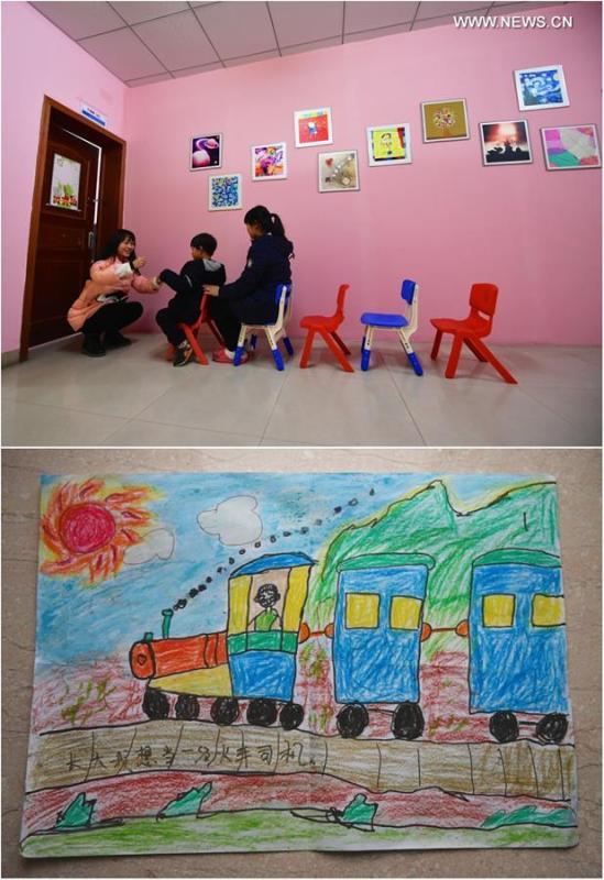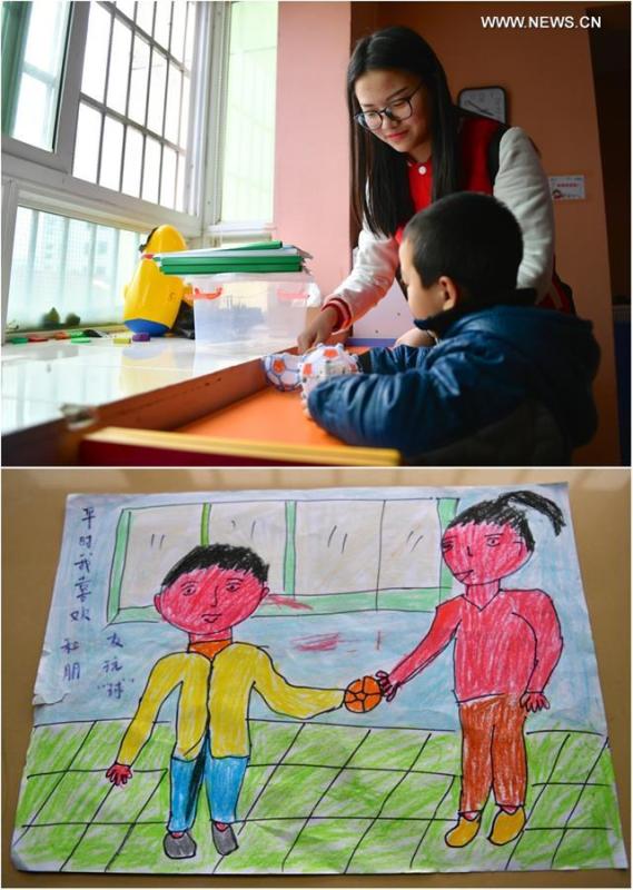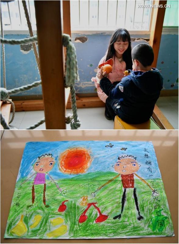 Combination photo taken on March 24, 2017 shows 6-year-old autistic child Xiao Jie (pseudonym) and his mother at Daqingshan Lake Park (upper) and Xiao Jie's painting about his wish to travel frequently with his parents (lower) in Nanchang, capital of east China's Jiangxi Province. April 2 marks the World Autism Awareness Day. (Xinhua/Hu Chenhuan)