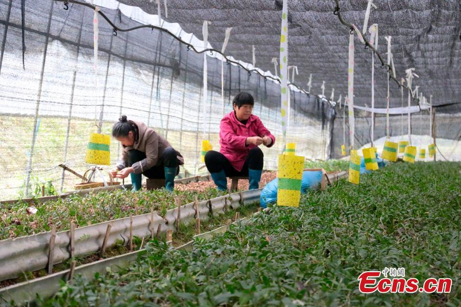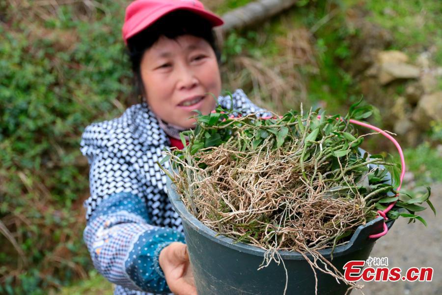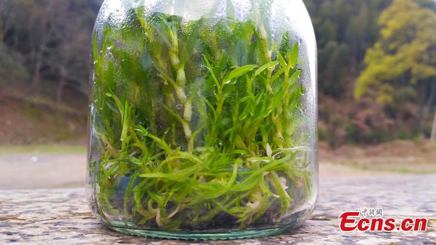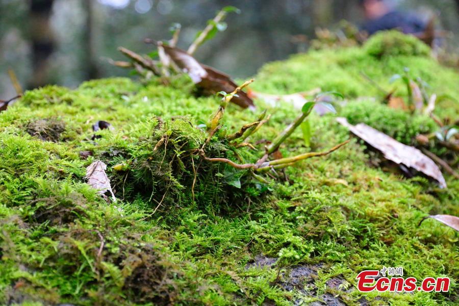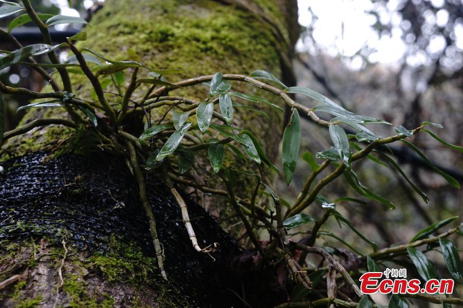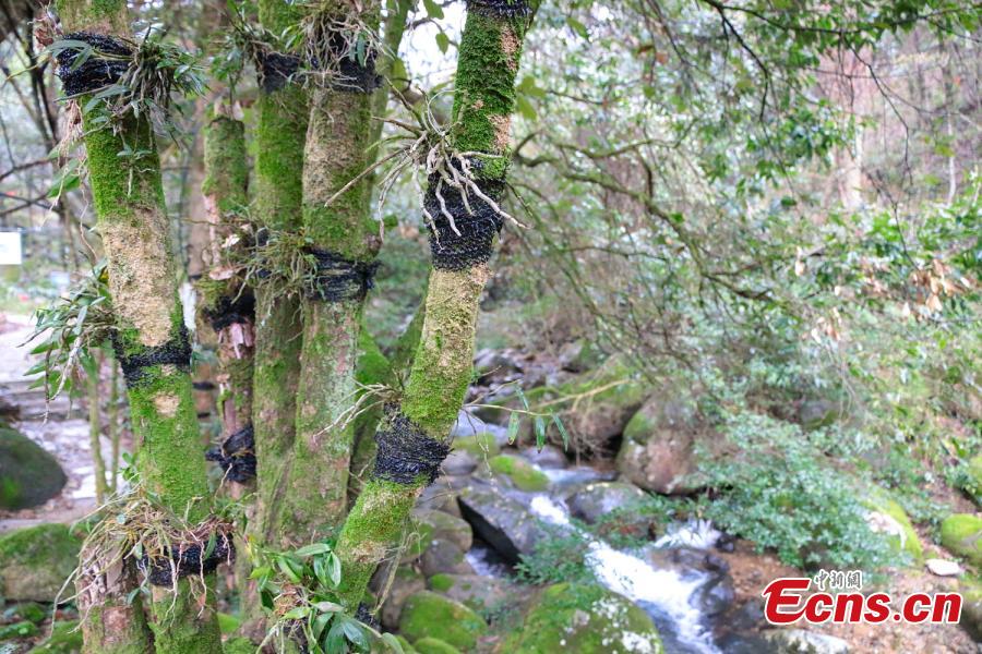 Photo taken on March 29, 2017 shows a cultivation base of Dendrobium officinale Kimura et Migo, a prized ingredient in traditional Chinese medicine, on Mount Damao in Dexing City, East China’s Jiangxi Province. Workers first grow plant seedlings in greenhouses for three years before transplanting them onto trees to grow after another three years in a good environment. The price of the herbal medicine is about 4,000 yuan ($580) per kilogram. (Photo: China News Service/Wang Haoyang)