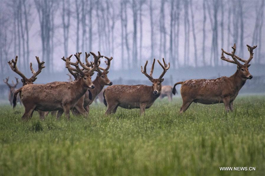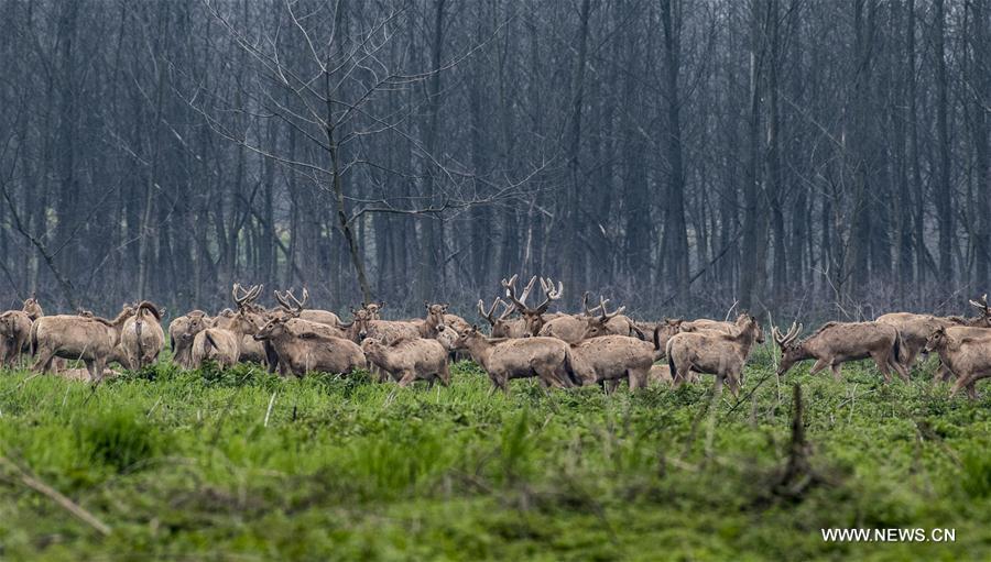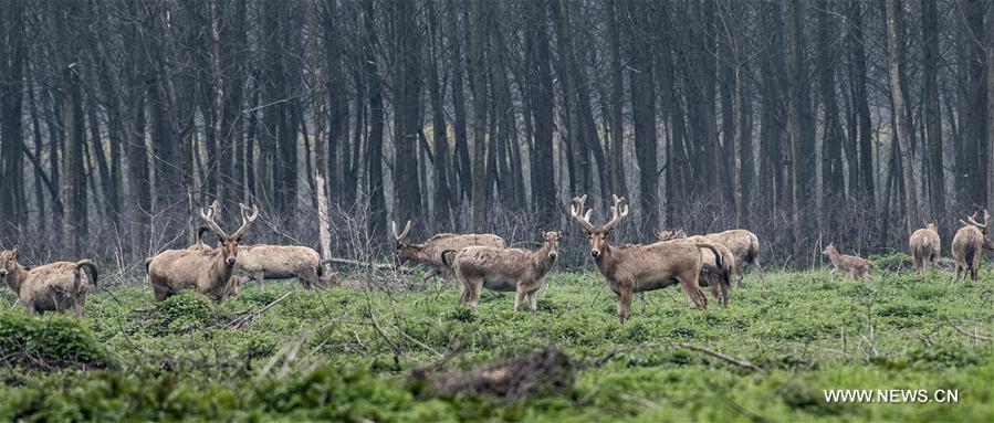 Elks are seen at the Tian'ezhou National Nature Reserve for Elk in Shishou City, central China's Hubei Province, March 28, 2017. The nature reserve has seen its number of elks increasing from only 64 in 1990s to more than 1,000 nowadays. (Xinhua/Du Huaju)