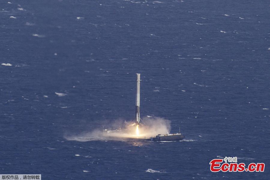 The reusable main-stage booster from the SpaceX Falcon 9 rocket makes a successful landing on a platform in the Atlantic Ocean about 300 km off the coast of Florida April 8, 2016 in this handout photo provided by SpaceX. SpaceX successfully launched and then retrieved its first recycled rocket Thursday, a historic feat and the biggest leap yet in its bid to drive down costs and speed up flights. (Photo/Agencies)