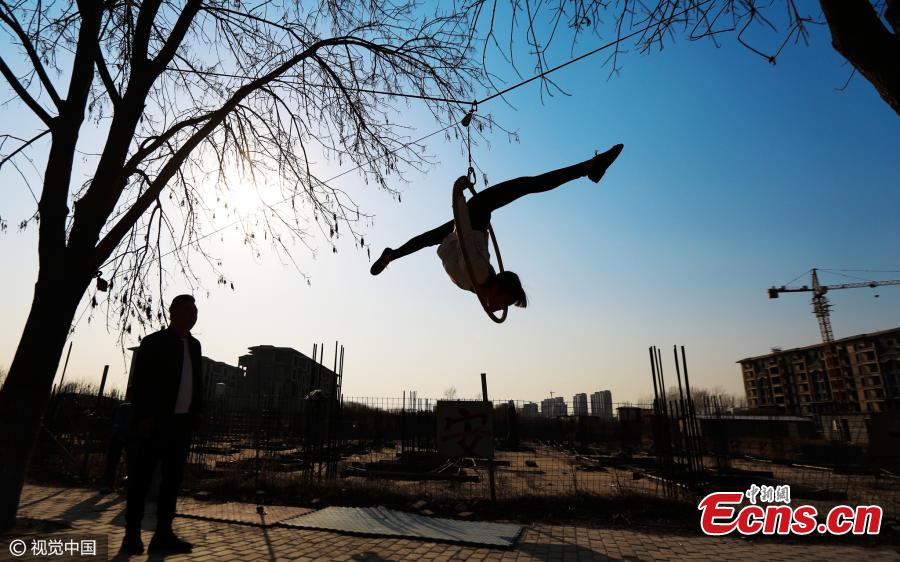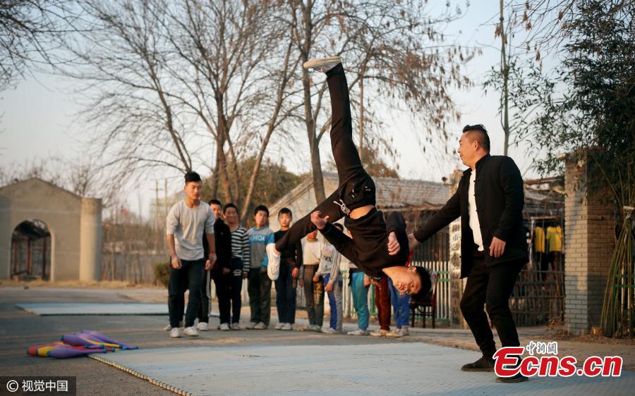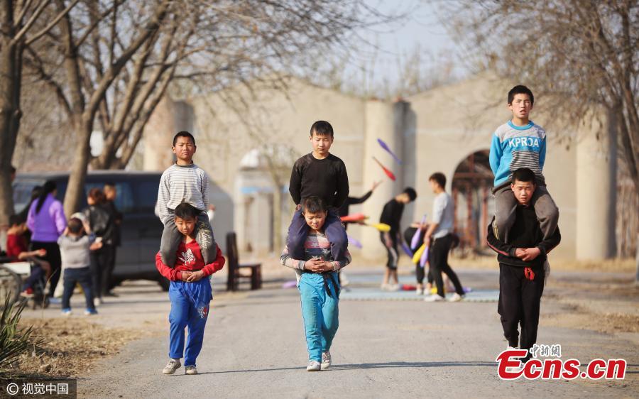 Liu Fu teaches children acrobatics at an art school in Puyang City, Central China’s Henan Province, March 31, 2017. Liu began to run the school after he was released from prison three years ago. In prison, he realized that many youths committed crimes mainly because they are from divorced families and lack education or support. The school now has more than 20 children who are either from poor families or orphans. Liu teaches the students for free. Due to financial difficulties, the school has moved several times and now is based at a rural home inn. Without formal classrooms, students sometimes learn acrobatics in the street. (Photo/CFP)
