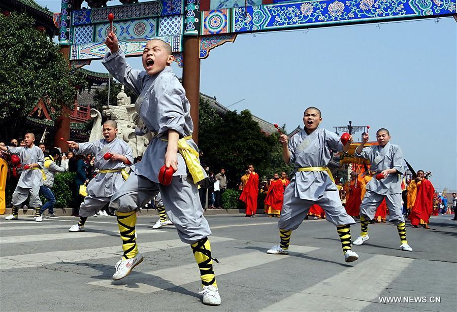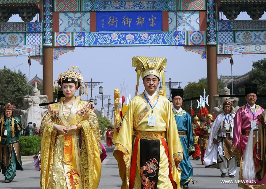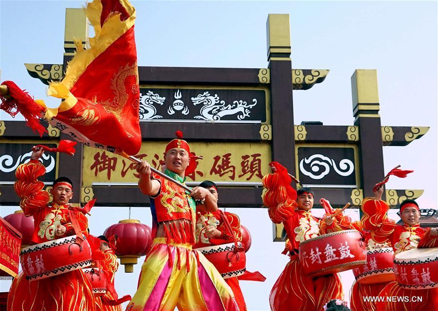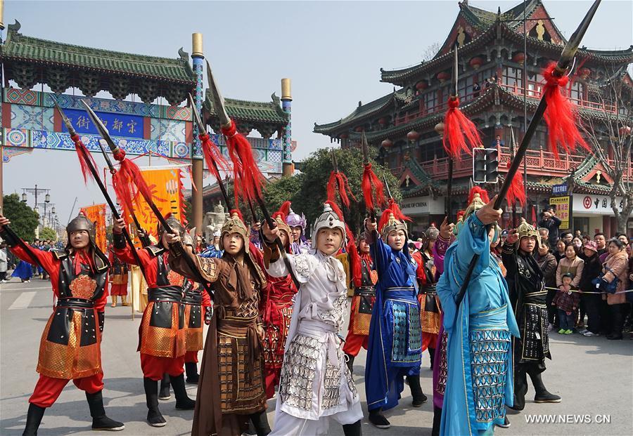 Performers show on a Qingming holiday parade in Kaifeng, central China's Henan Province, April 1, 2017. (Xinhua/Li An)