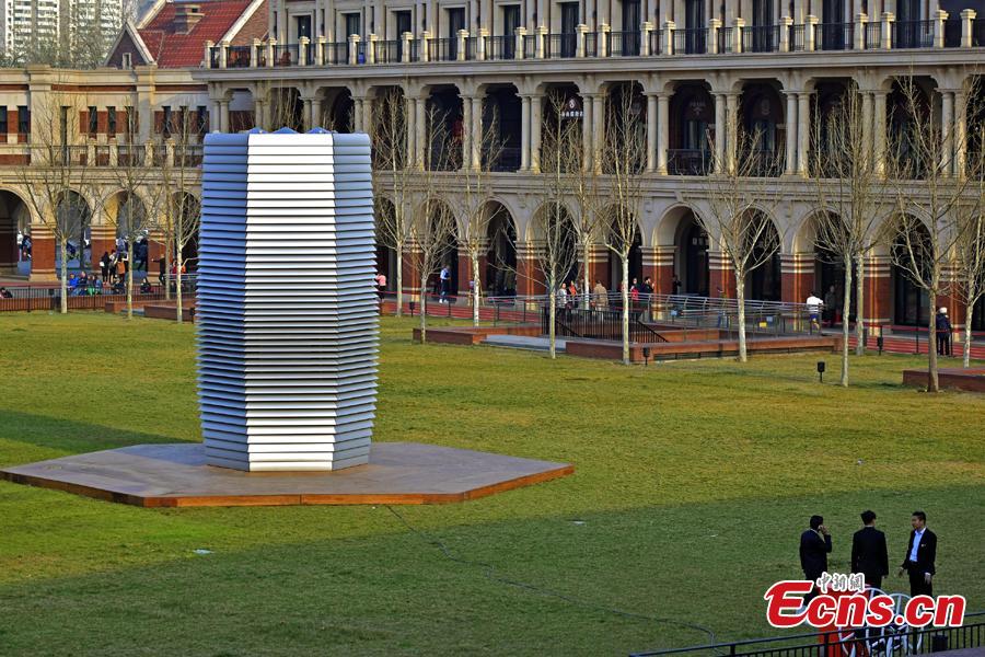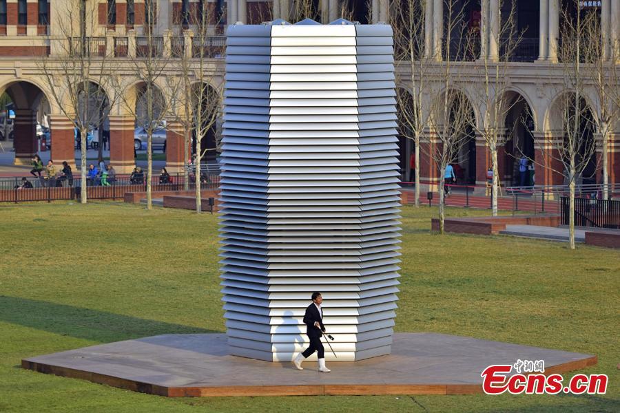 The smog free tower is installed in North China's Tianjin city on April 1, 2017. Dutch designers have brought the seven-meter-tall tower to North China's Tianjin city. It is designed to suck polluted air in through electrostatic adsorption technology and filter out the smog particles before releasing clean air. (Photo: China News Service/Tong Yu)