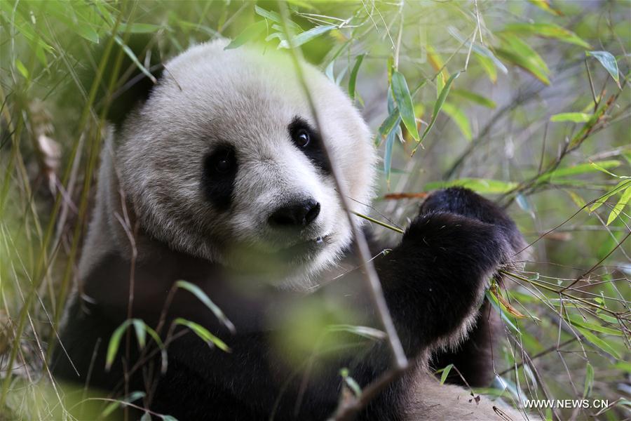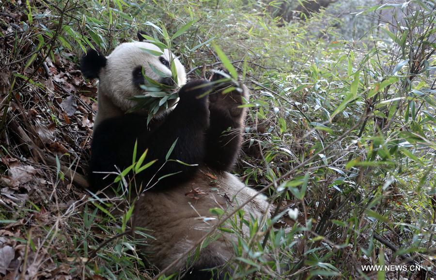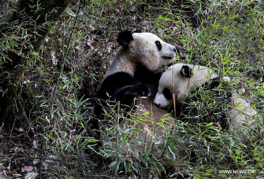 A wild giant panda cub is seen on a tree with its mother in the Qinling Mountains in northwest China's Shaanxi Province, April 1, 2017. (Xinhua/Pu Chunju)