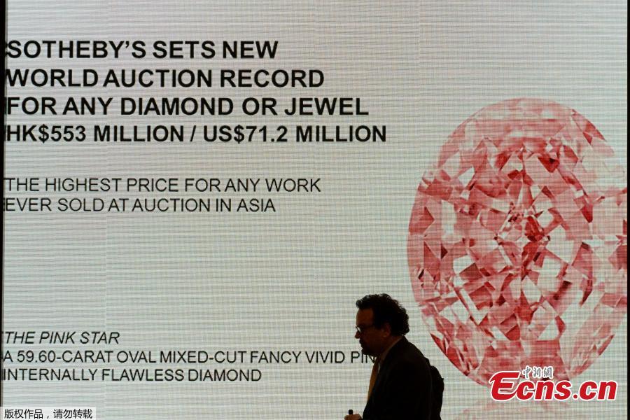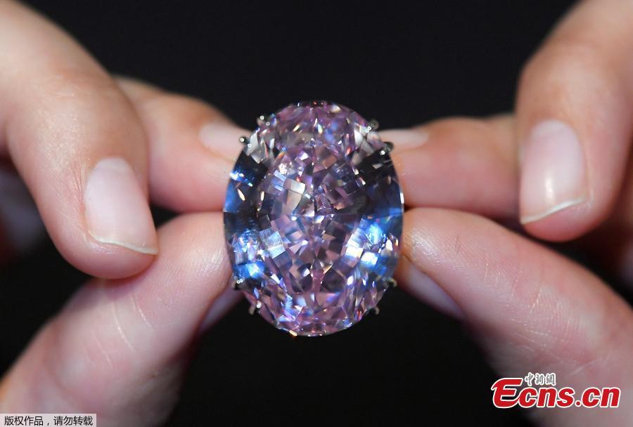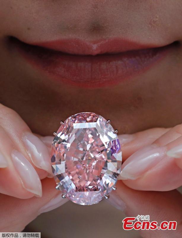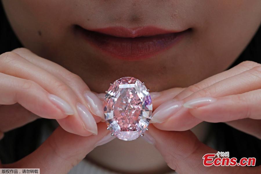 FILE PHOTO: A model poses with a 59.60-carat mixed cut diamond known as "The Pink Star", the largest Internally Flawless Fancy Vivid Pink diamond ever graded by the Geological Institute of America (GIA), ahead of being auctioned in Hong Kong by Sotheby's. The oval pink diamond was auctioned for 0.553 billion Hong Kong dollars (71.2 million U.S. dollars) at Sotheby's Hong Kong jewels and jadeite spring sale on Tuesday, setting a new world record for any diamond or jewel.(Photo/Agencies)