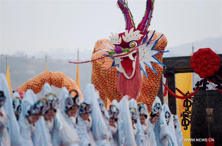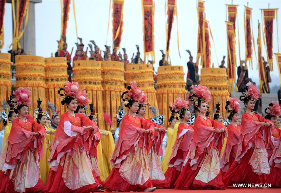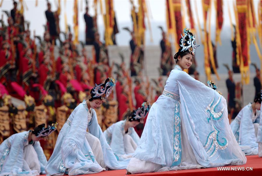 Performers dance during a memorial ceremony to worship "Yellow Emperor" who according to legend reigned nearly 5,000 years ago and is regarded as the ancestor of all Chinese people, in Huangling County, northwest China's Shaanxi Province, April 4, 2017. Over 10,000 people attended the ceremony on Tuesday which is also the Qingming Holiday, or the Tomb-Sweeping Day. (Xinhua/Li Yibo)