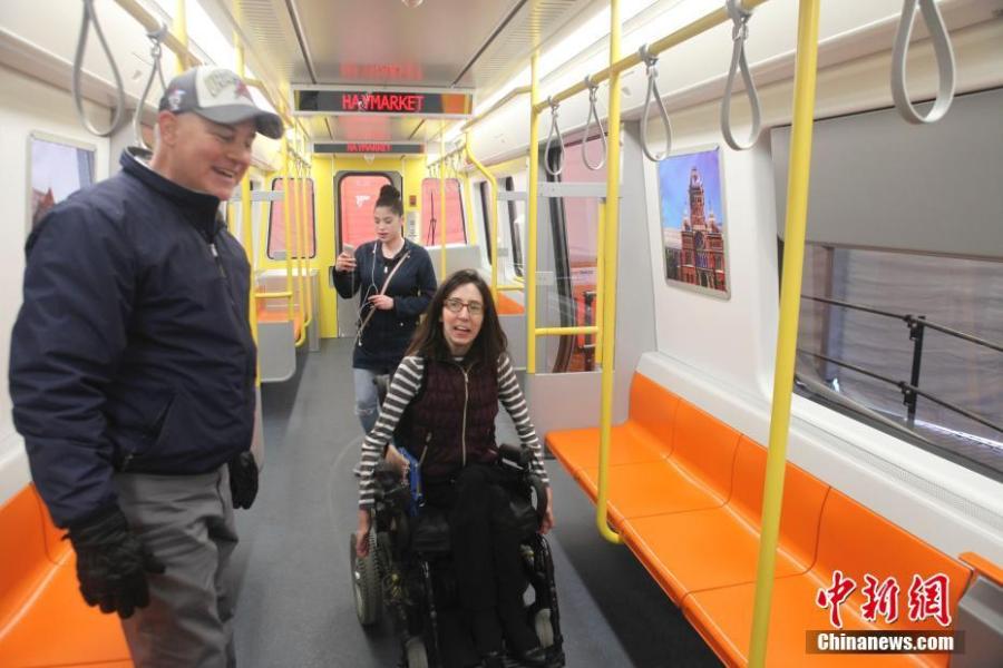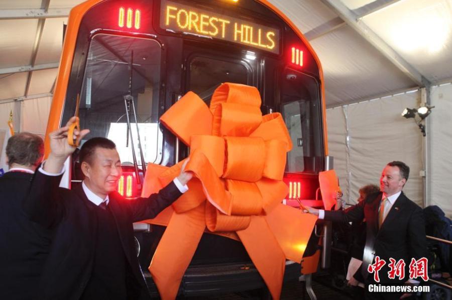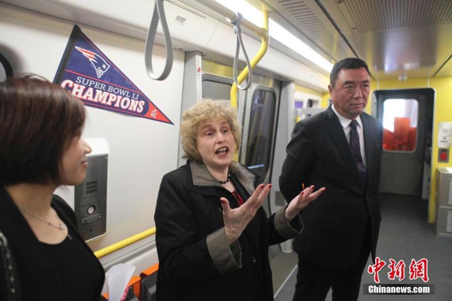 A ceremony to mark the display of the Orange Line mockup at City Hall Plaza in Boston, Massachusetts, April 3, 2017. The two-thirds model of the design for the new MBTA trains was produced by CRRC, the Chinese company that plans to manufacture the fleet of 152 Orange Line and 252 Red Line trains at a factory in Springfield. (Photo: China News Service/Ma Delin)