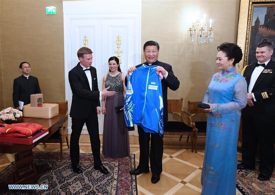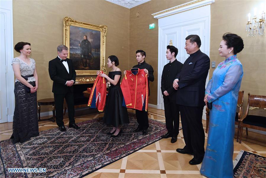 Chinese President Xi Jinping and his Finnish counterpart Sauli Niinisto meet skaters' representatives from the two countries in Helsinki, Finland, April 5, 2017. The athletes just attended the World Figure Skating Championships 2017, which ran from March 29 to April 2 in Helsinki, Finland. (Xinhua/Rao Aimin)