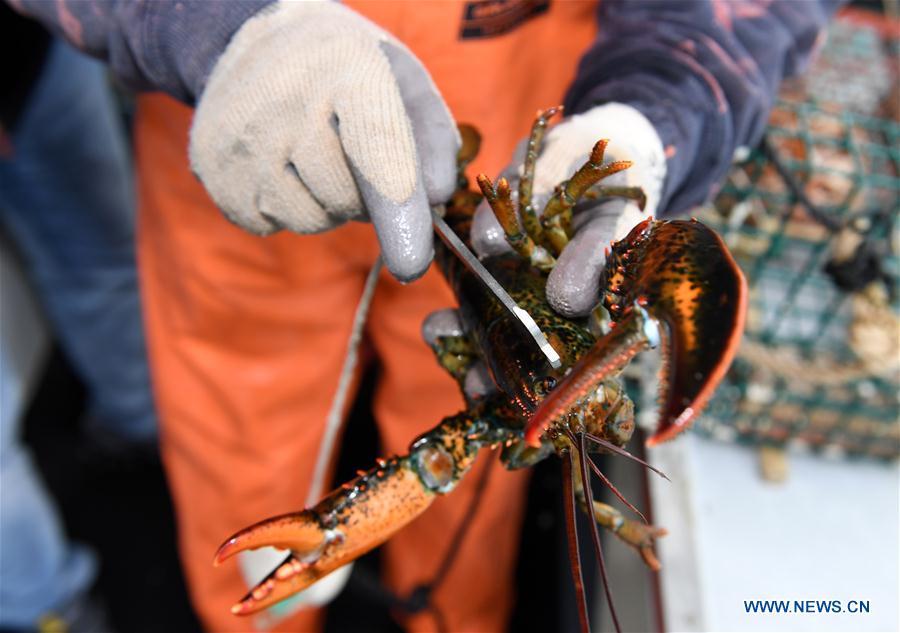 Phil Miles (L) and Dave Bedell of Maine Coast company pack lobsters in Portland, Maine, the United States, March 29, 2017. In 2016, China bought 40.9 million dollars' worth of lobsters from Maine, where most of America's lobsters are caught. (Xinhua/Yin Bogu)