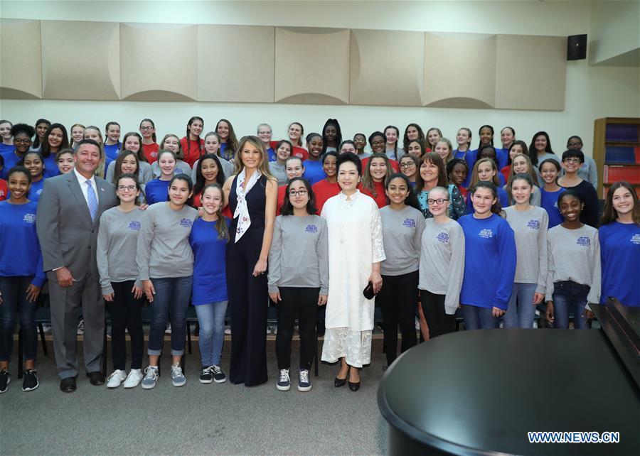 Peng Liyuan, wife of Chinese President Xi Jinping, talks with a student of Chinese descent in a class about politics and economics during her visit to the Bak Middle School of the Arts in West Palm Beach, Florida, the United States, April 7, 2017. Peng Liyuan, accompanied by U.S. First Lady Melania Trump (not pictured), visited the art school on Friday. (Xinhua/Wang Ye)